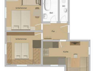 Apartment 1st floor 70 m²: Entrance hall with wardrobe, bathroom (bath and washbasin), sep. WC, kitchen (stove, refrigerator, coffee maker, toaster and kettle), living room with dining table and double sofa bed with TV, from the living room connecting