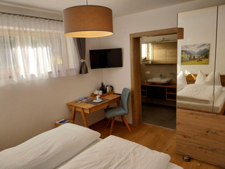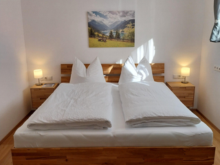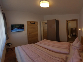 In unserem neu errichteten Haus befinden sich zwei Einheiten, im Obergeschoss die Ferienwohnung und im Untergeschoss ein Doppelzimmer mit Bad.