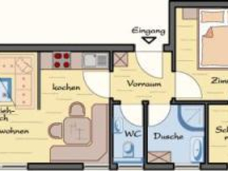 Beschreibung: Komfortable, komplett neu ausgestattete Ferienwohnung für bis zu 4 Personen. Ausstattung: Gemütliches Wohnzimmer mit Flat-TV, Sat, Sofa mit Couchtisch. Angrenzende Küche mit grosser Eckbank, Tisch und zwei Stühlen. WC mit Waschbecken, Bad