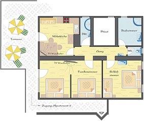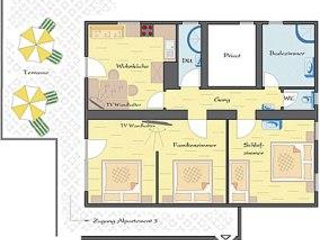Beschreibung: Komfortable, komplett neu ausgestattete Ferienwohnung für bis zu 7 Personen. Ausstattung: Gemütliche Küche mit Flat-TV, Sat, Sofa , Sitzecke mit 2 Stühlen, große Terasse. WC mit Waschbecken, 1. Bad mit Dusche und großem Waschbecken,