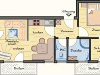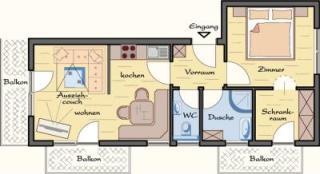 Beschreibung: Komfortable, komplett neu ausgestattete Ferienwohnung für bis zu 4 Personen. Ausstattung: Gemütliches Wohnzimmer mit Flat-TV, Sat, Sofa mit Couchtisch, Balkon. Angrenzende Küche mit grosser Eckbank, Tisch und zwei Stühlen. WC mit