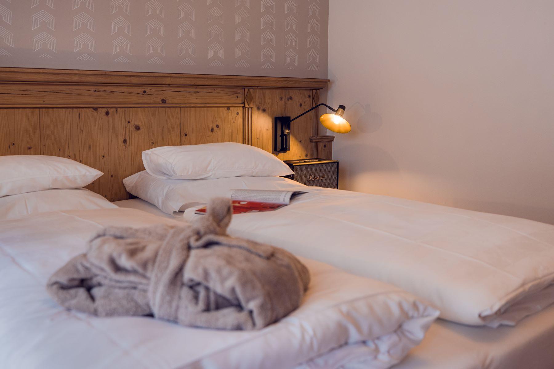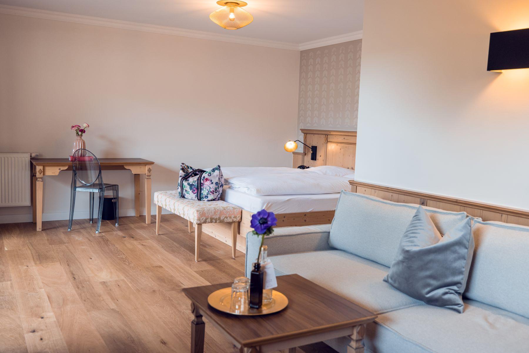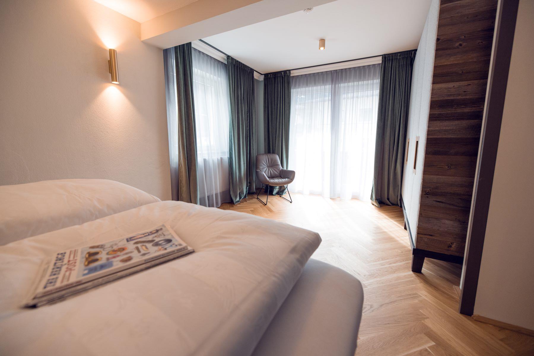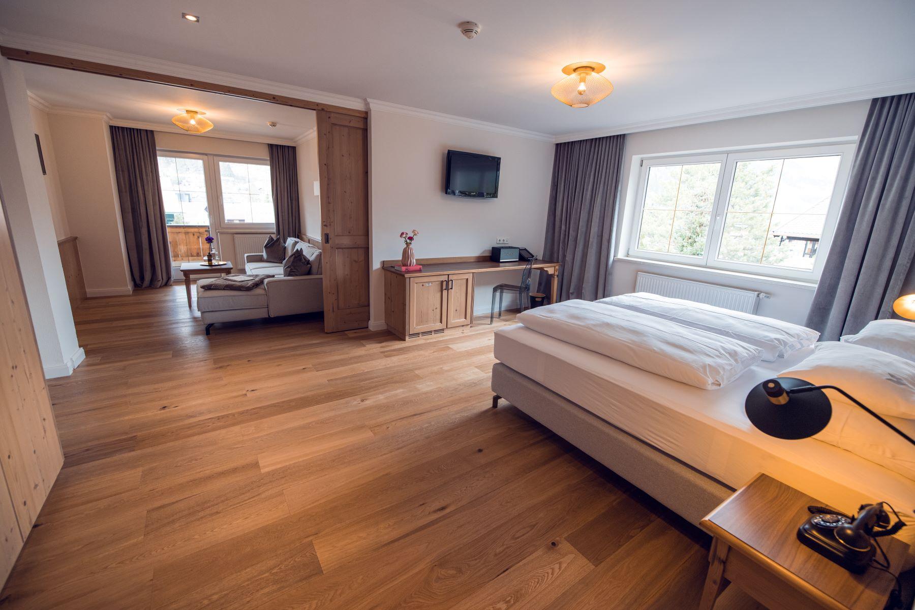 Eine Klasse für sich: Großzügiger Grundriss mit Ankleidebereich, luxuriösen Kommoden, massiven Schränken und Lehnsessel für den gehobenen Anspruch. Die lichtdurchfluteten Charming Suiten gibt es in zwei Varianten: im edlen, gehobenen Alpenstil mit