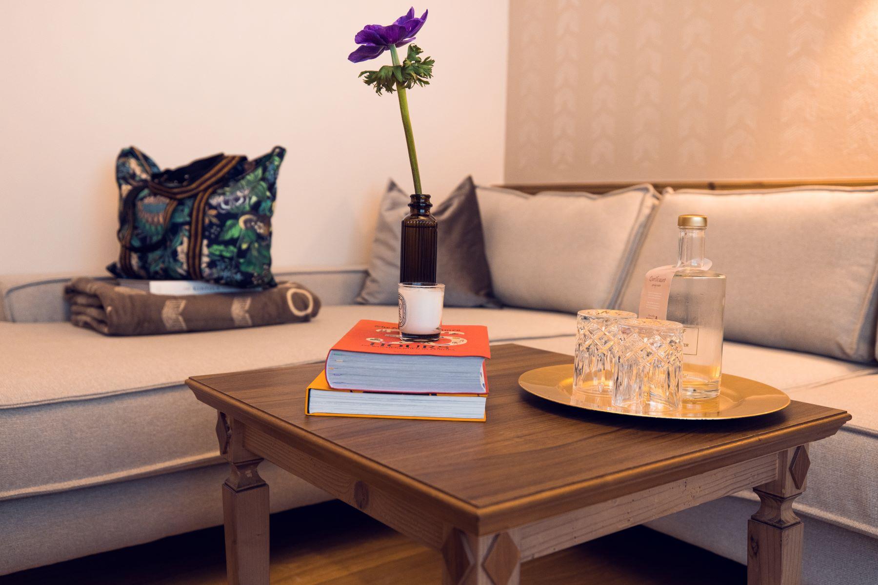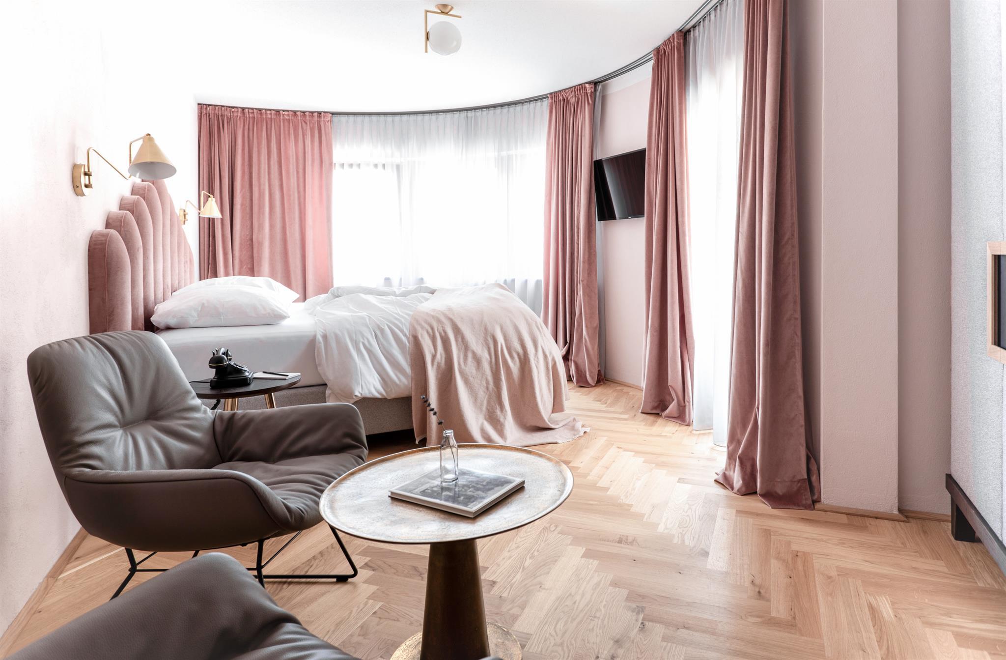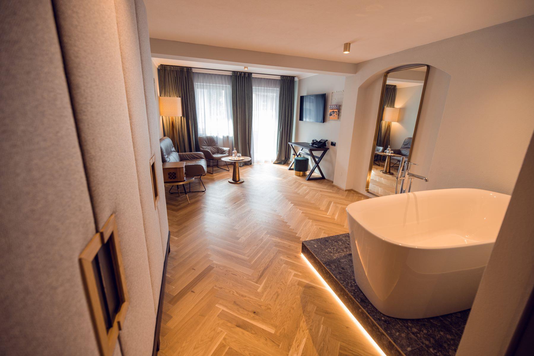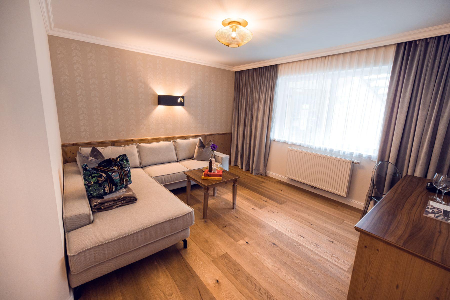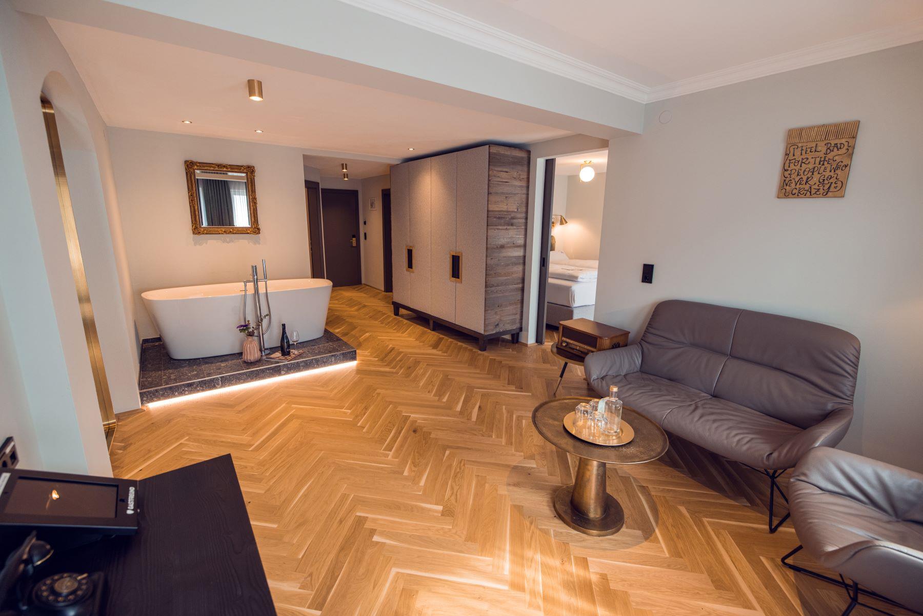 Homely comfort: Unser Charakterzimmer inkl. großzügiger Chillout-Zone für stilvolles Wohnen mit Alpenpanorama. Das Highlight: Der gekonnte Mix aus urbanem Style mit alpinem Flair - mit state-of-the-art Boxspringbetten, schicken Leder Lounge Chairs und