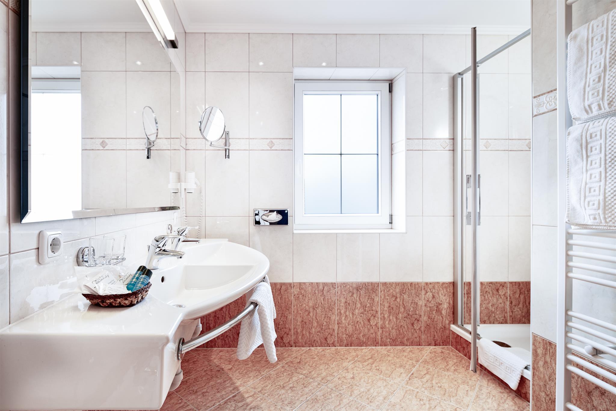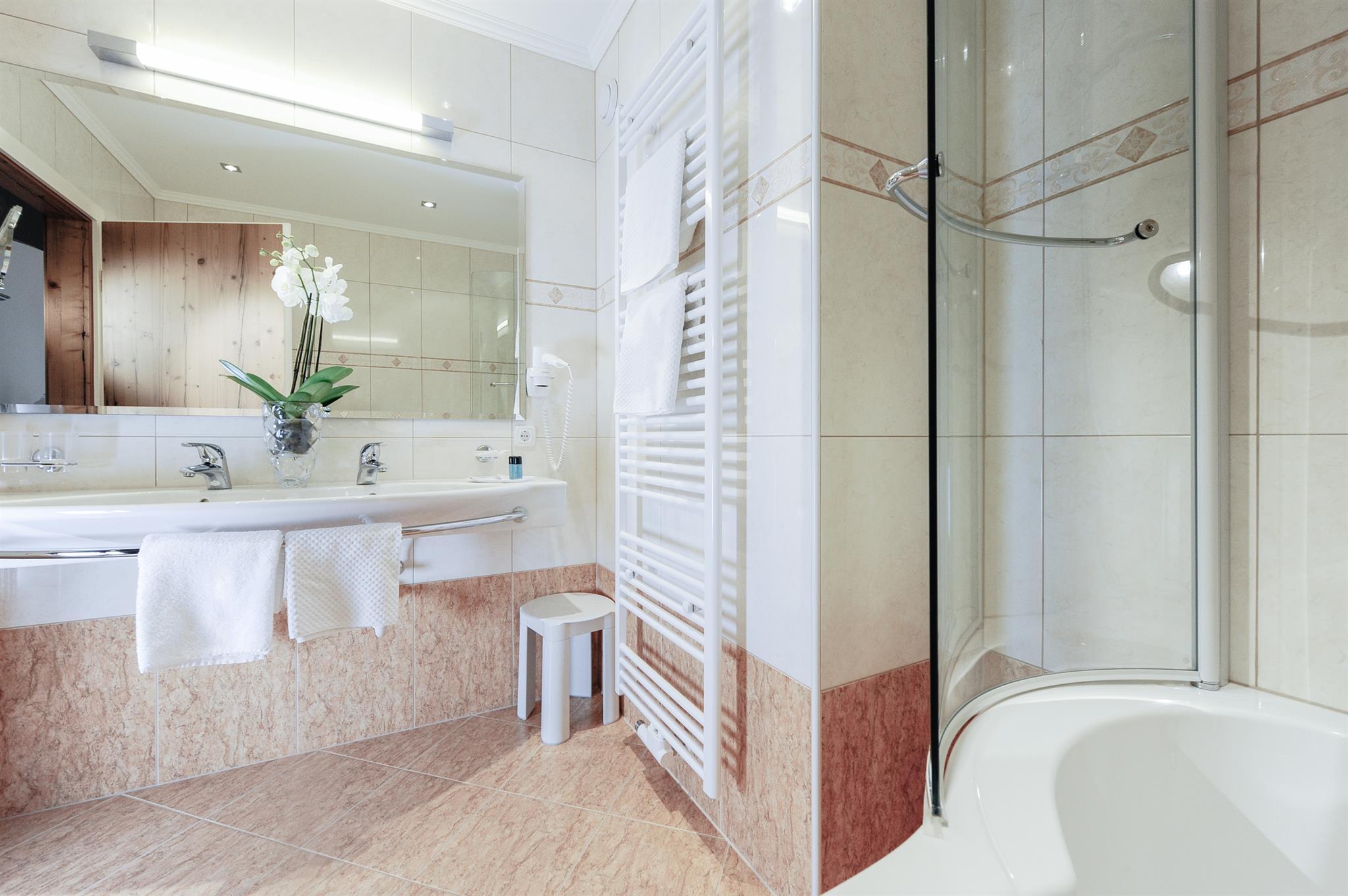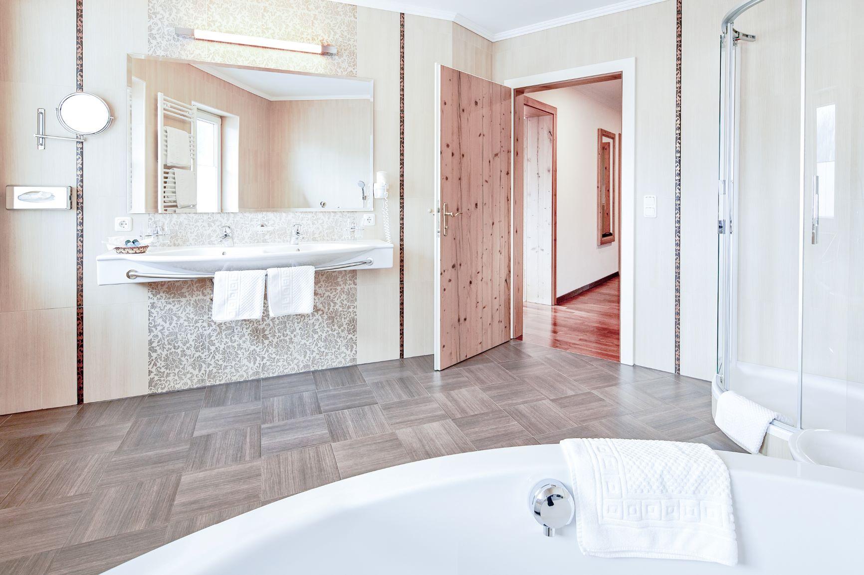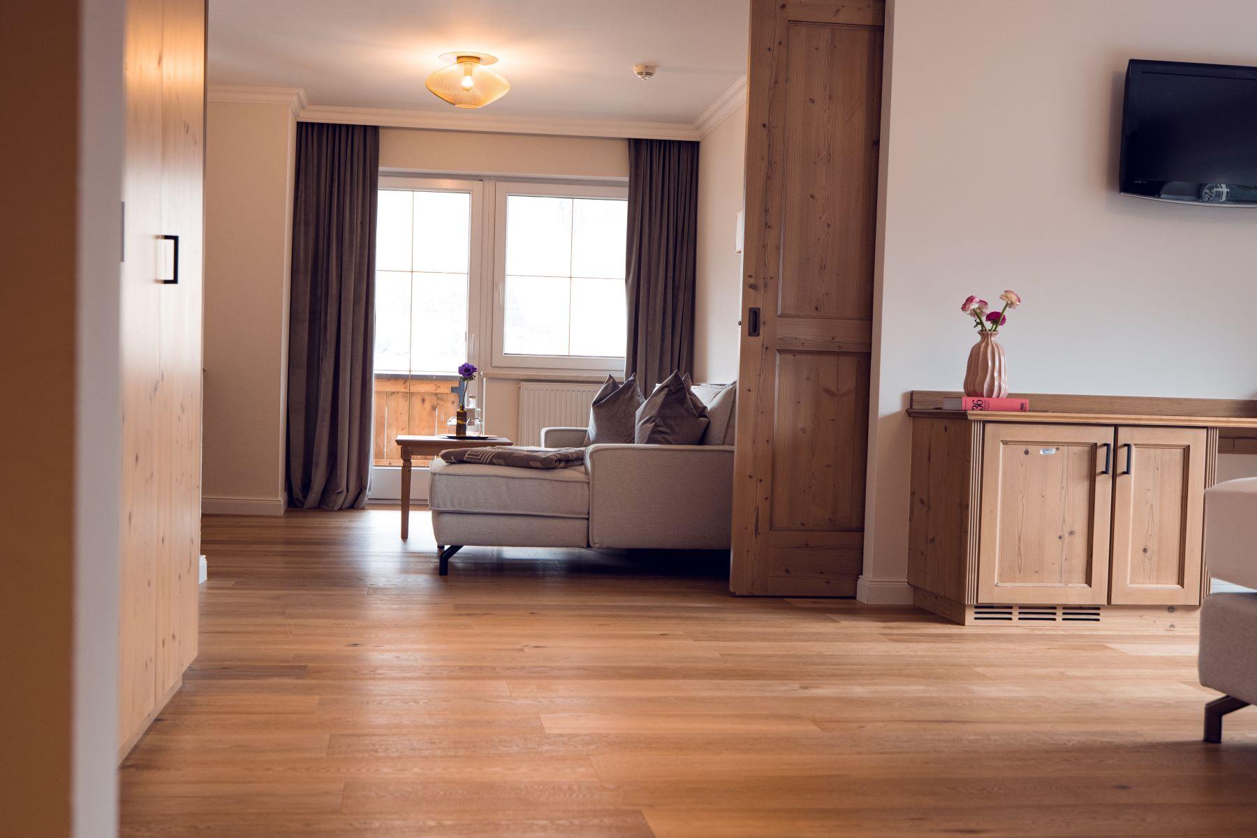 Großzügiger Grundriss mit viel Sonne und Alpenblick, eigenem Ankleidebereich, luxuriösen Holzkommoden und stilvoller Vintage-Sitzecke im Tiroler Stil. Non-smoking Zirben-Doppelbett Kuschelige allergikerfreie Bettdecken Geräumiges Bad mit mit getrenntem