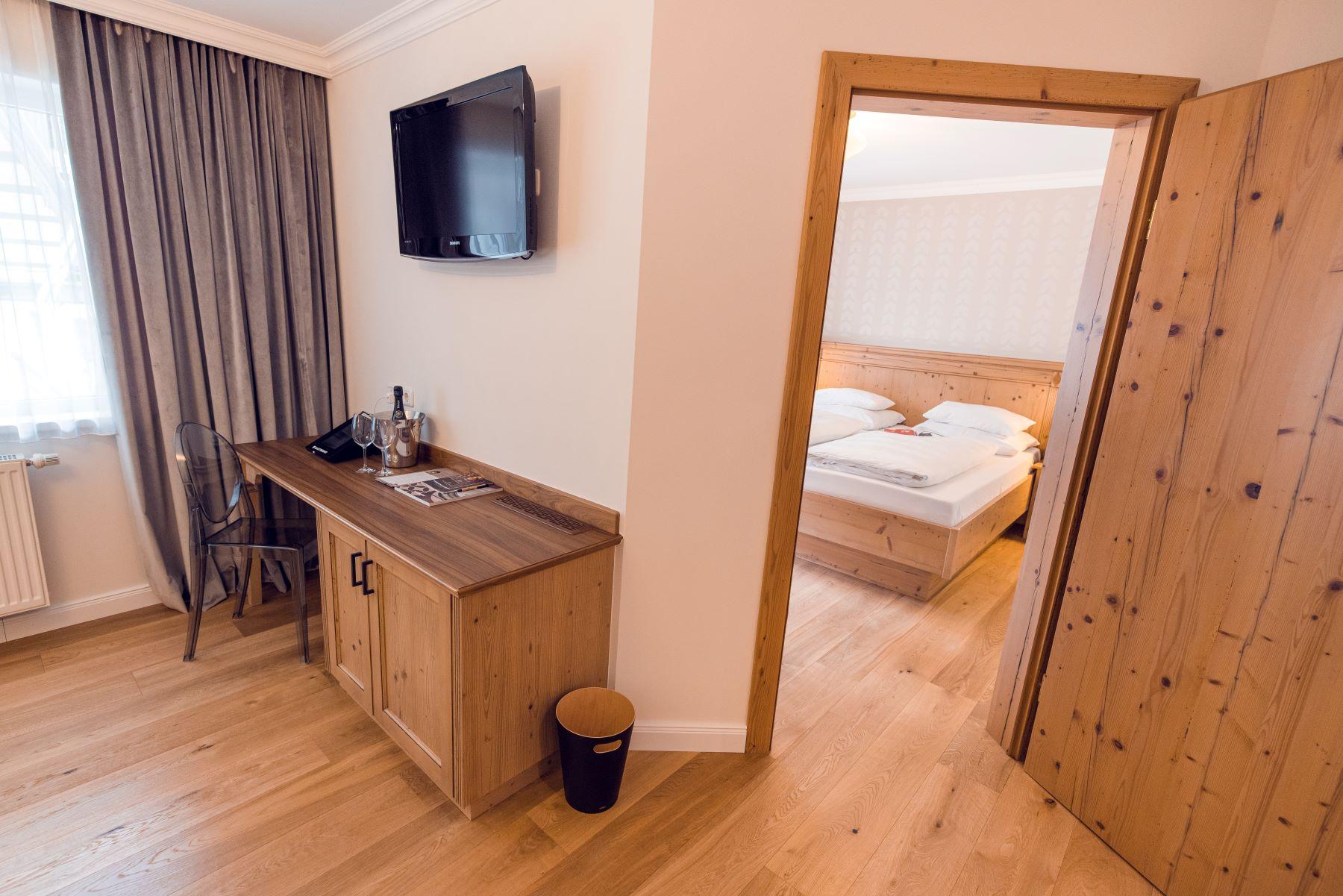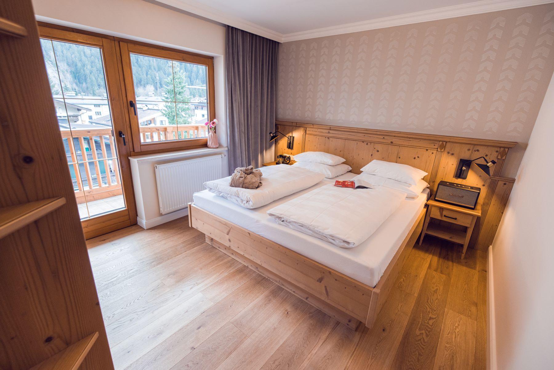 Eine Stilklasse für sich: Großzügiger Grundriss mit viel Sonne und Alpenblick, eigenem Ankleidebereich, luxuriösen Holzkommoden und stilvoller Vintage-Sitzecke im Tiroler Stil. Non-smoking Zirben-Doppelbett Kuschelige allergikerfreie Bettdecken