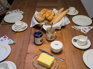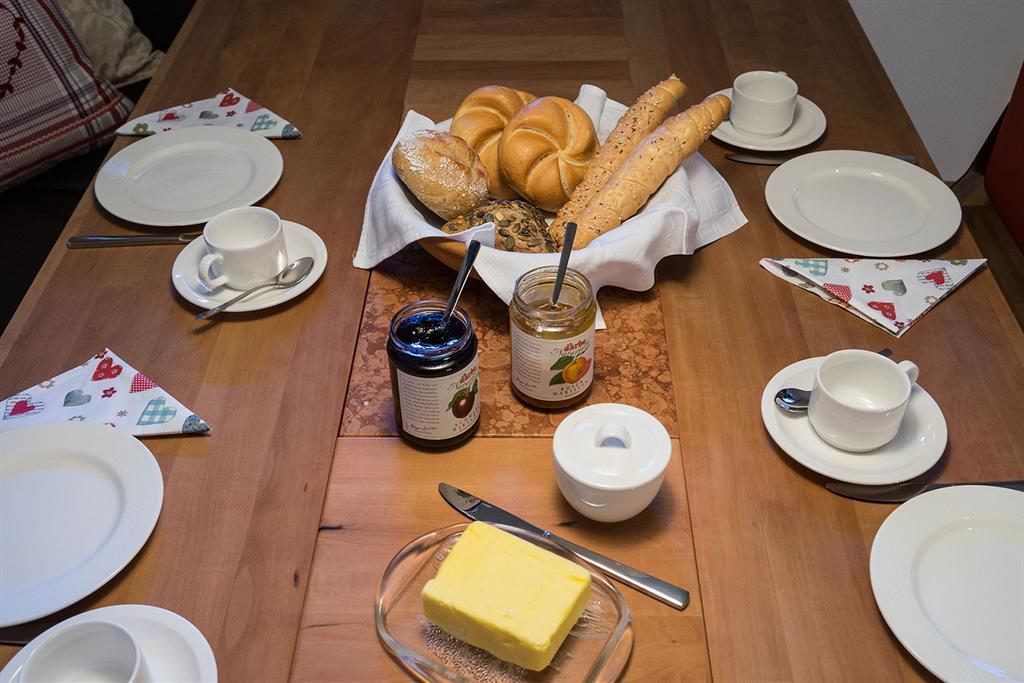 Bei Ihrer Ankunft erwartet Sie eine Grundausstattung für ein Frühstück: Milch, Kaffeesahne, 2 Nespresso-Kapseln, Teebeutel, Zucker, 1 Portion Butter und Marmelade, 1 Semmel, pro Person ...und reines Quellwasser aus unseren Bergen – frisch vom Wasserhahn!