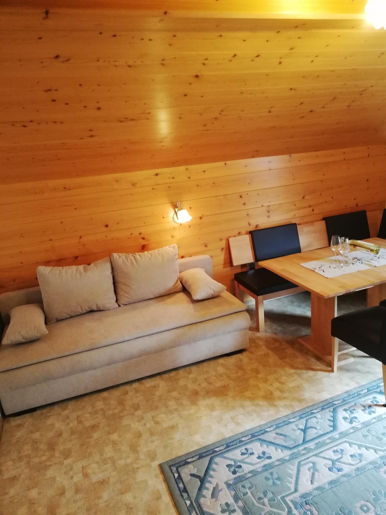 Ferienwohnung für 2- 3 Personen, geräumiger Wohnraum mit komplett eingerichteter Küchenzeile und Schlafcouch, ein Doppelzimmer und DU/WC (Nord-und Südbalkon) Doppelzimmer mit DU/WC und Balkon gegenüber auf gleicher Etage