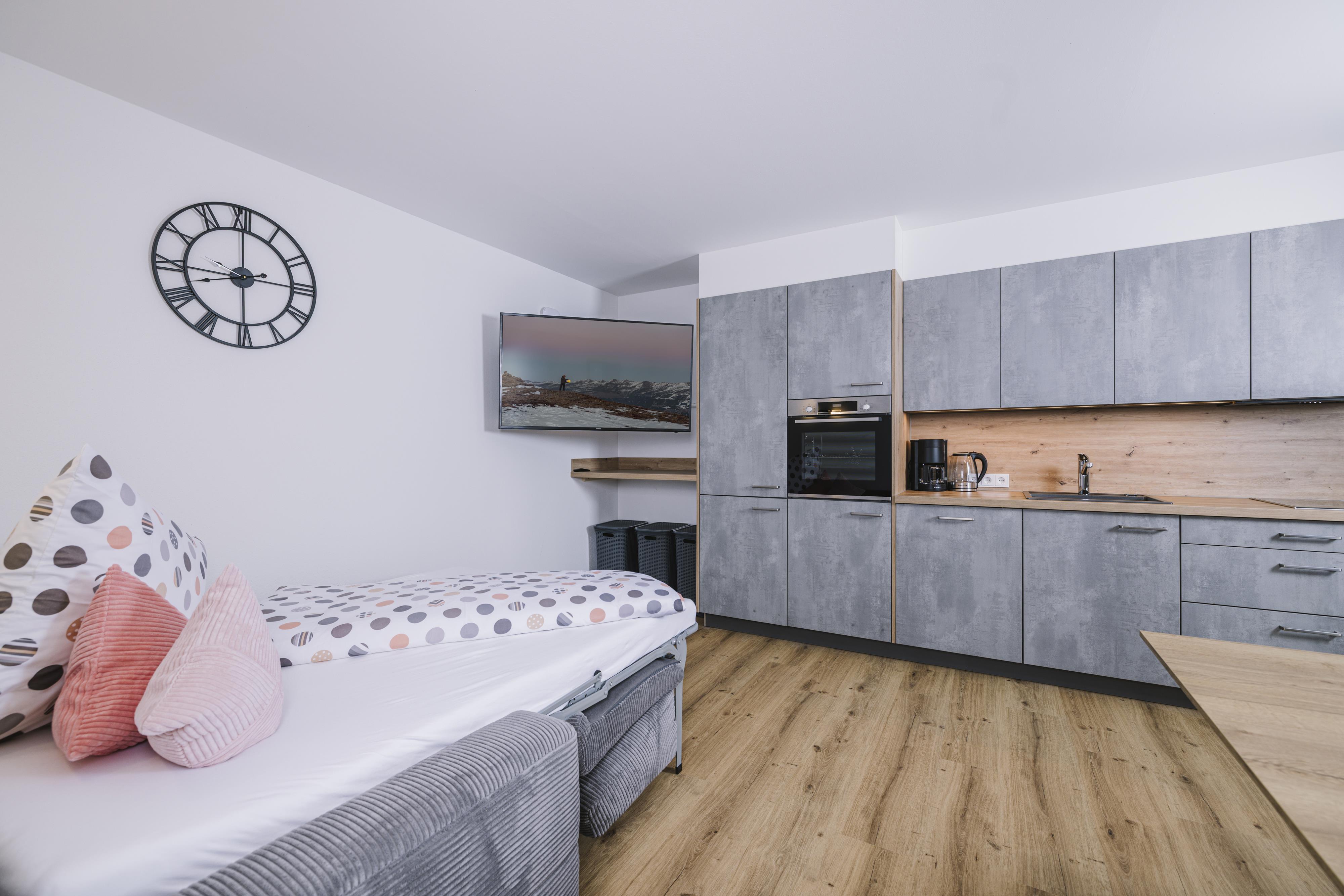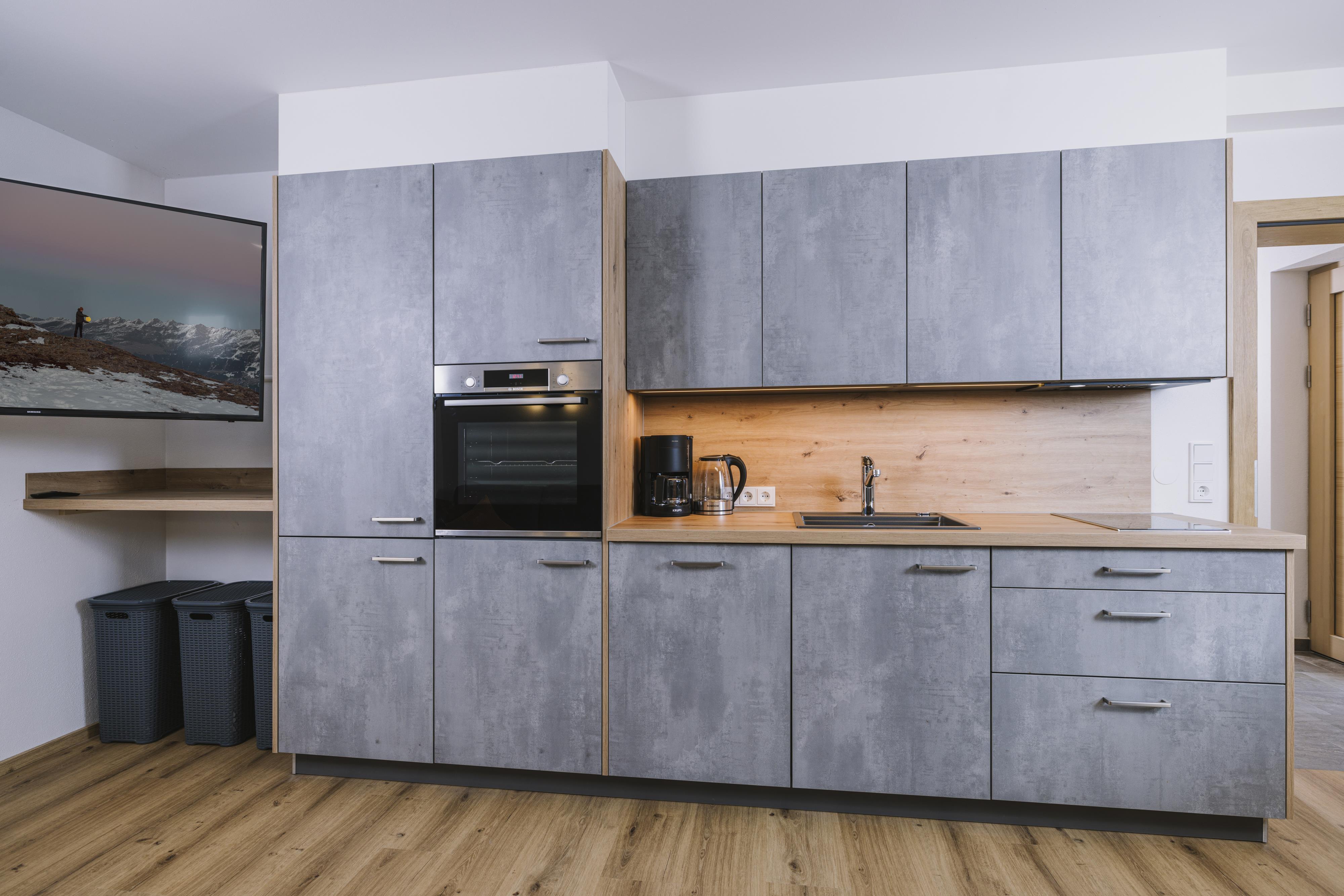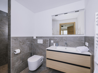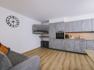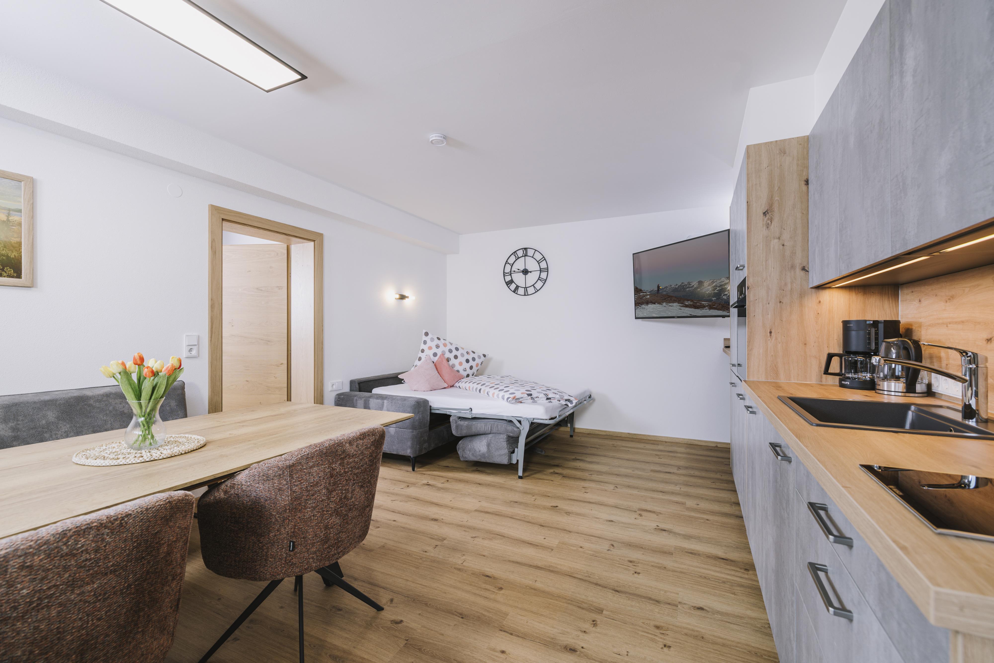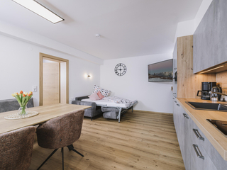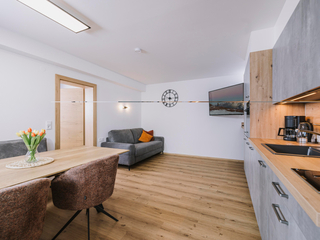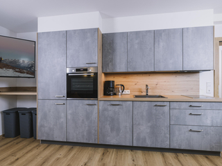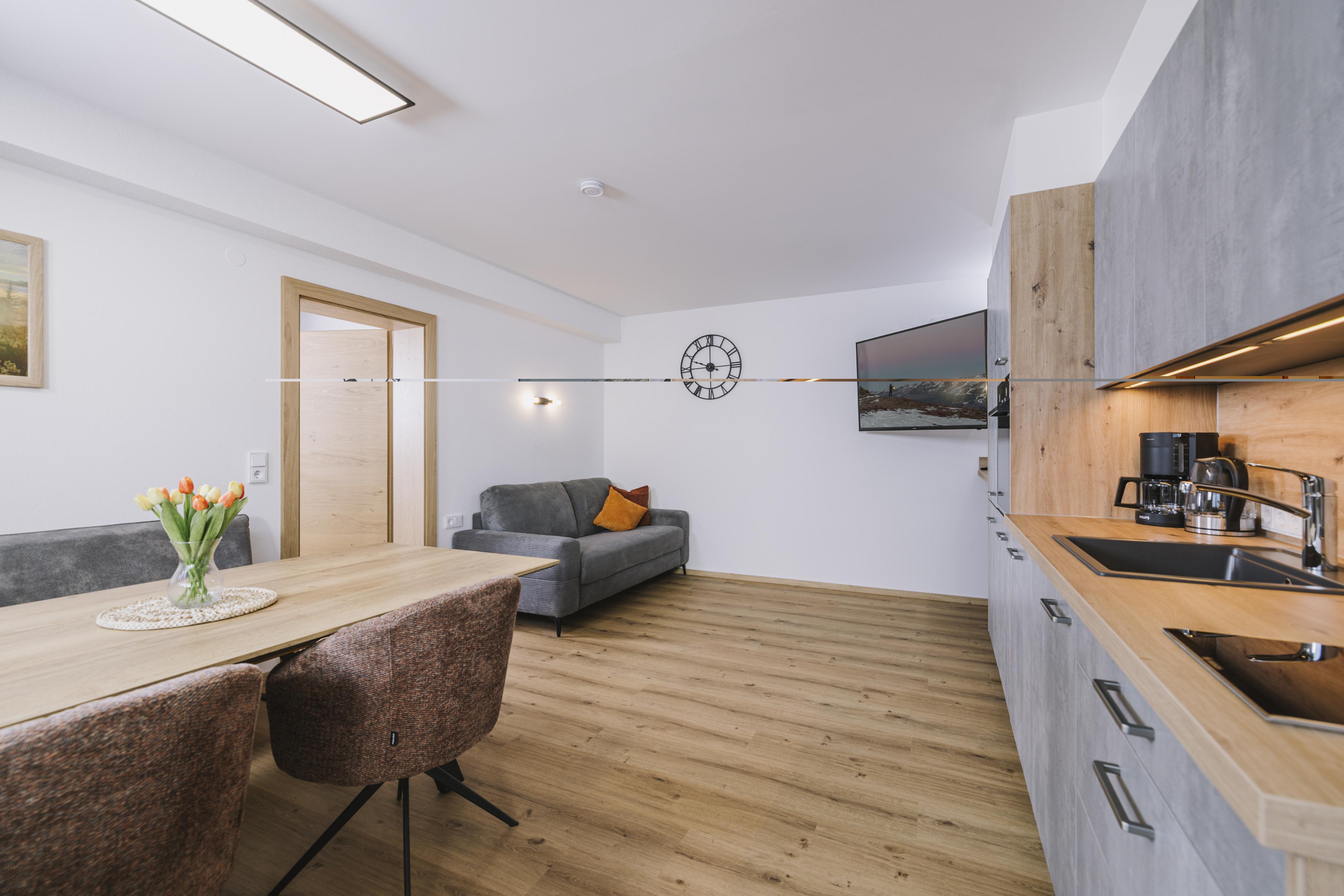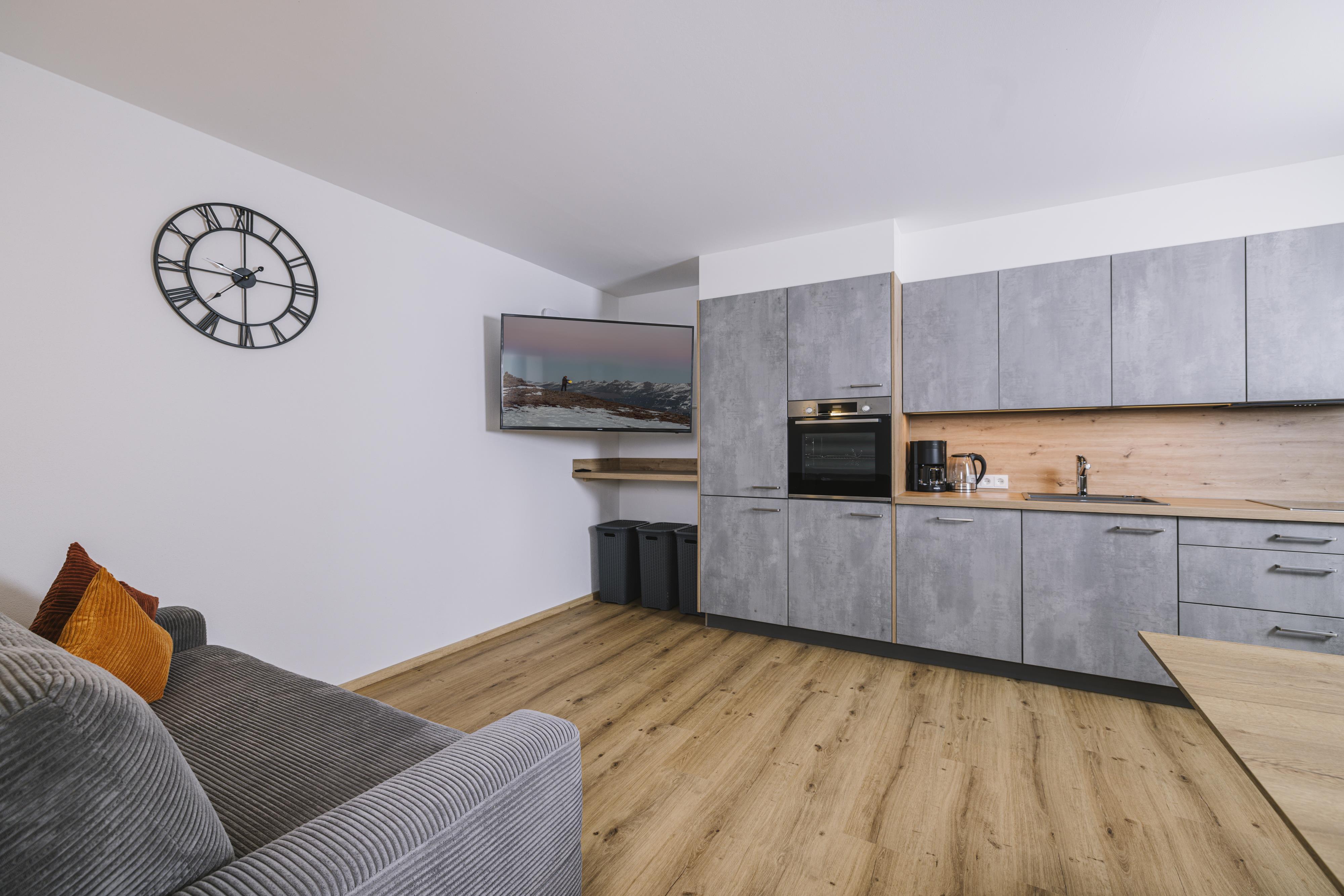 Die neu errichtete, moderne Wohnung verfügt über zwei Schlafzimmer mit jeweils eigenem Bad sowie einen großzügigen Wohn- und Essbereich mit Schlafcouch, TV und voll ausgestatteter Küche. Ein Skischuhtrockner und Skiaufhänger im Eingangsbereich sorgen für