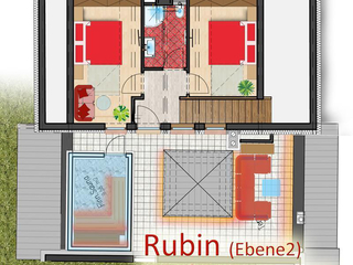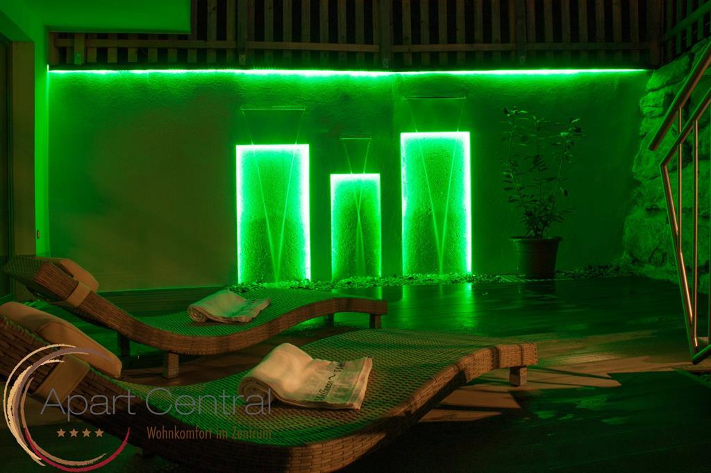 100 m² Maisonette-Ferienwohnung über 2 Ebenen, private Sauna mit Ruhebereich, Innenhof mit Wasserfall, Effektbeleuchtung und Musikanlage, überdachte Terrasse, 2 wahlweise 3 Schlafzimmer, vollausgestattete Küche mit Marken-Einbaugeräten, geräumiger