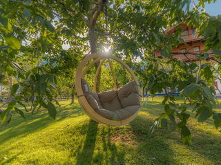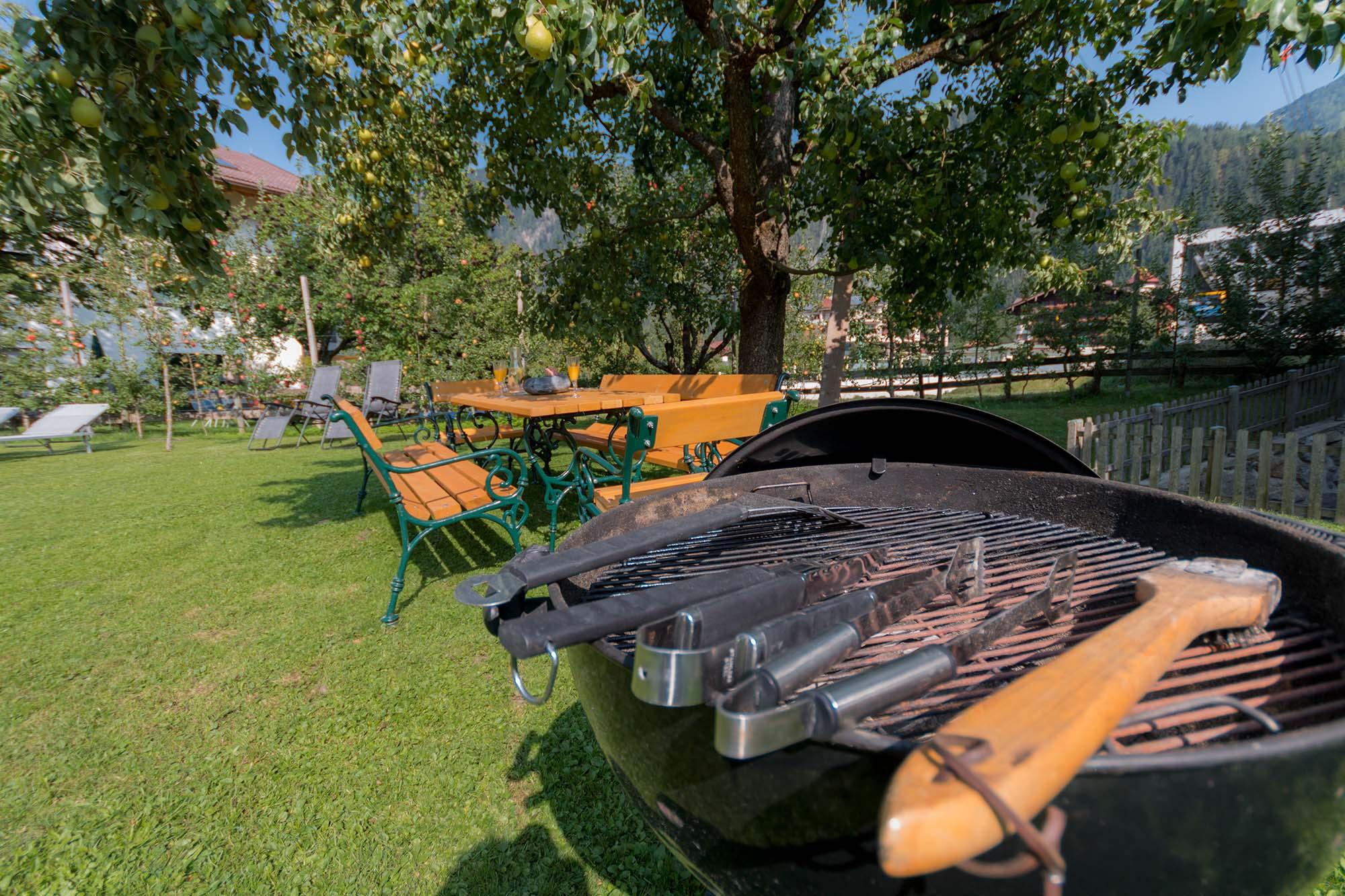 Außenbereich: 1000m² Gartenanlage mit Liegewiese, sicherer Kinderspielbereich mit Trampolin und gemütlicher Grillbereich.