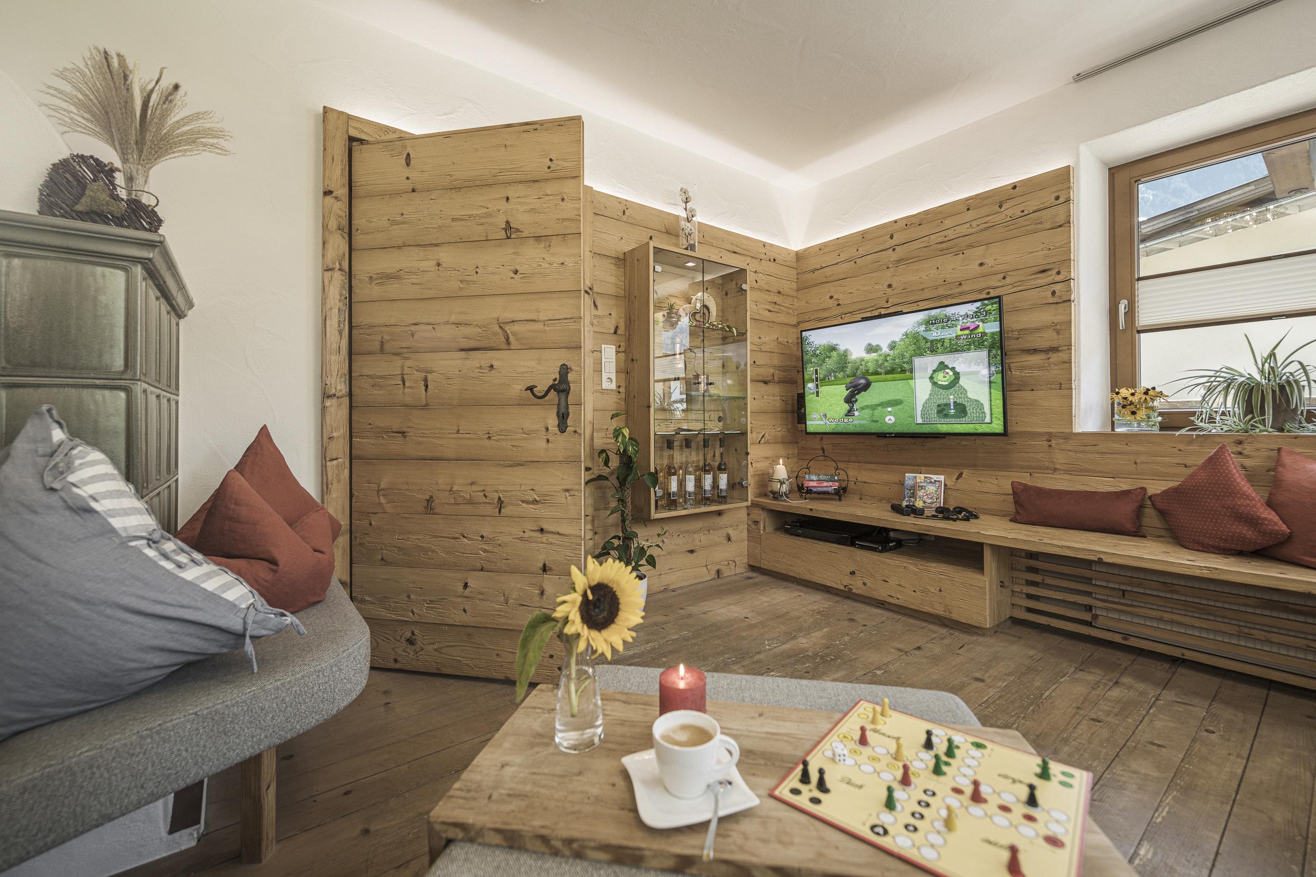 380m² Chalet mit 8 Schlafzimmer und privatem Wellnessbereich, Altholz Sauna, Infrarotkabine, Whirlwanne, Erlebnisdusche und Ruhebereich mit Solebrunnen. Neue, vollausgestattete Küche mit Marken-Einbaugeräten, Tiroler Stub´n mit Kachelofen, LED