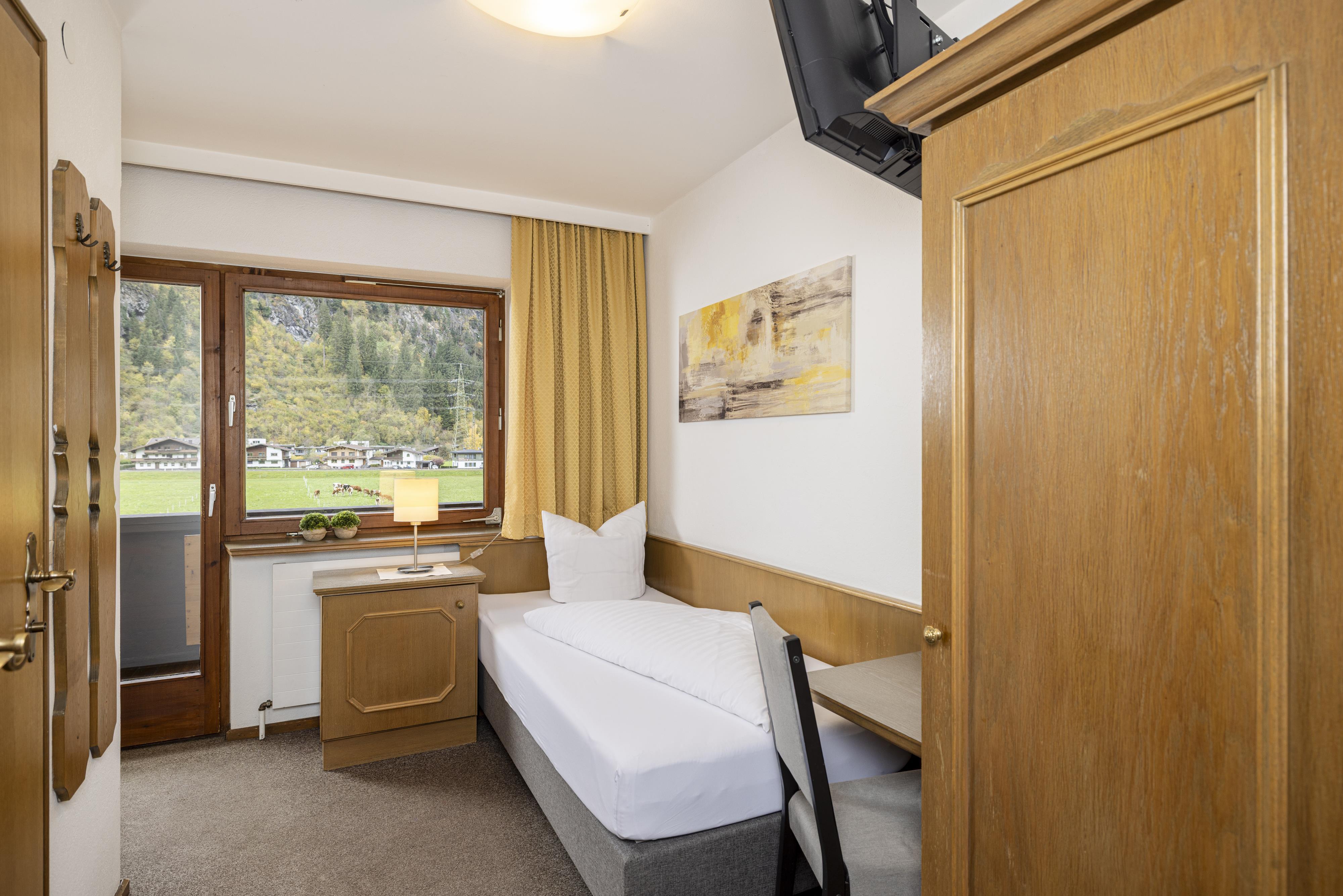 Gemütlich eingerichtetes Einzelzimmer mit Dusche, WC, Kabel-TV, Fön, Safe und Balkon ausgestattet.
