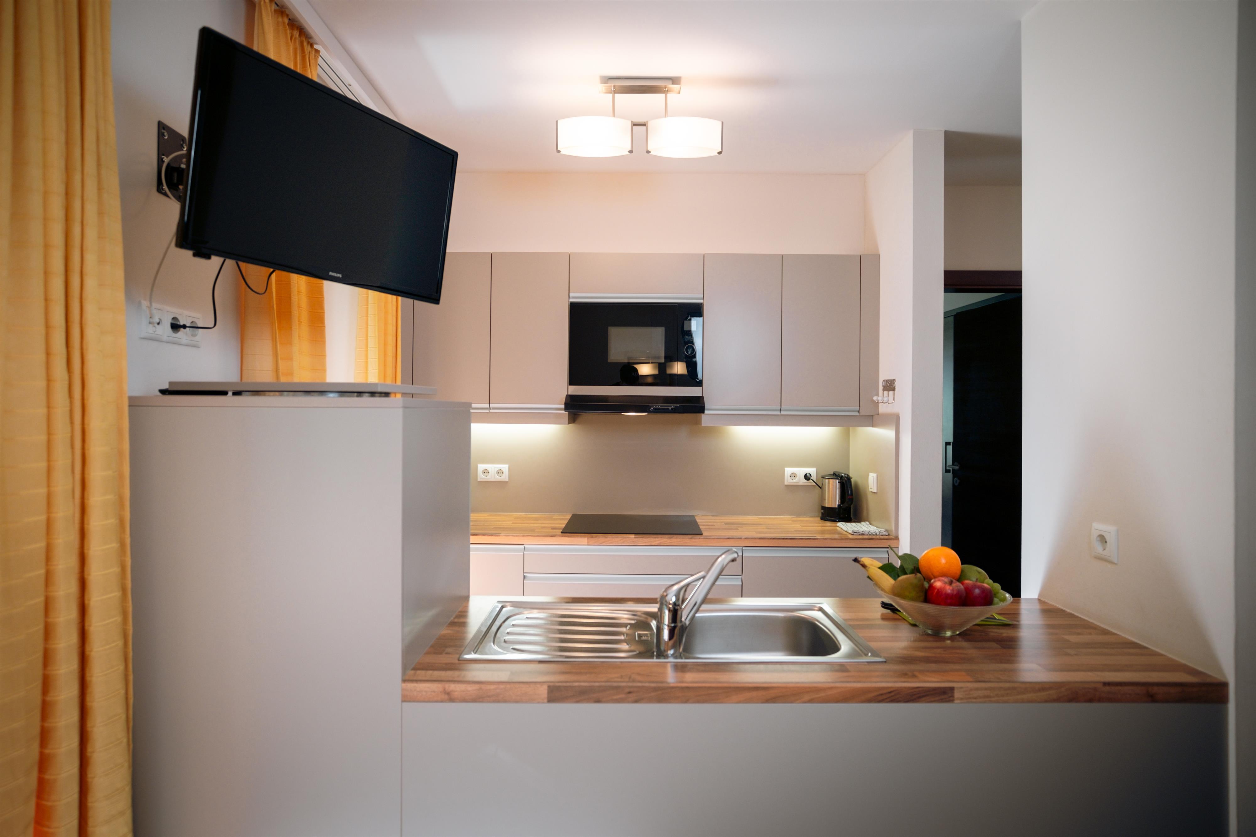 komplett ausgestattete Wohnküche, Ofenecke, ein Schlafzimmer, Balkon, Kabel-TV, Telefon, Bad/WC, Fön, Safe und Brötchenservice.