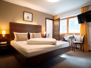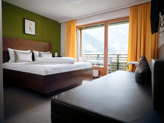 Komfortabel eingerichtetes Doppelzimmer mit Dusche/WC und Fön, Safe, Kabel-TV, Telefon, mit gemütlichem Sofa und Balkon ausgestattet.
