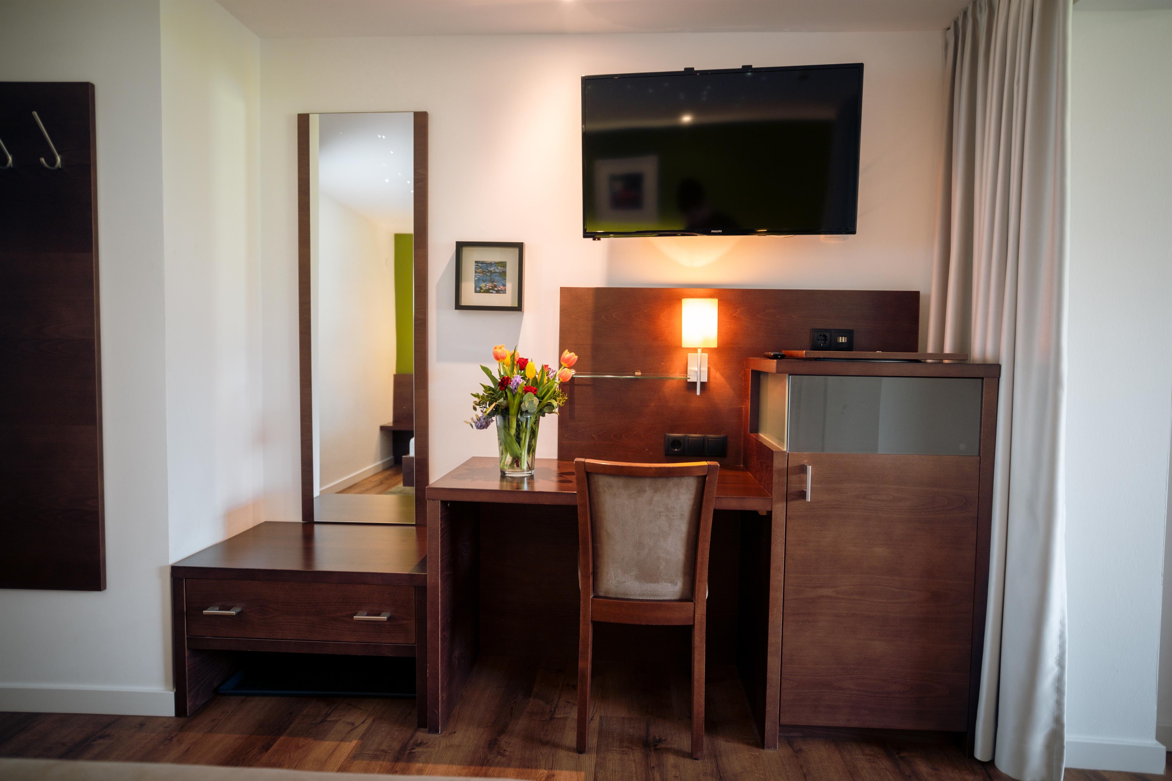 Gemütlich eingerichtetes Einzelzimmer mit Dusche, WC, Fön, Kabel-TV, Safe und Telefon ausgestattet.