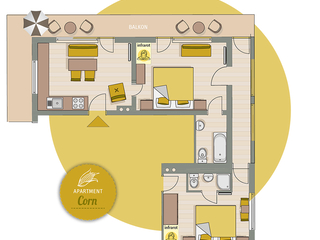 Das schick eingerichtete APARTMENT CORN befindet sich im 2. Obergeschoss, ist 65 m² groß und bietet Platz für bis zu 4 Personen. Entspannen Sie in den zwei Infrarotwärmekabinen und genießen Sie vom südseitigen Balkon einen herrlichen Blick auf den