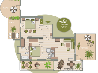 Das geschmackvoll eingerichtete APARTMENT OLIVE befindet sich im 1. Obergeschoss, ist 90 m² groß und bietet Platz für bis zu 6 Personen. Eine Besonderheit des Apartments ist der gemütliche Wintergarten mit der Physiotherm Ergo Relax Liege mit SENSOcare
