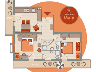 Das stilvoll eingerichtete APARTMENT CHERRY befindet sich im 2. Obergeschoss, ist 75 m² groß und bietet Platz für bis zu 4 Personen. Entspannen Sie in den zwei Infrarotwärmekabinen und genießen Sie vom nord- bzw. westlichen Balkon einen wunderbaren Blick