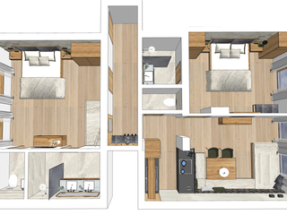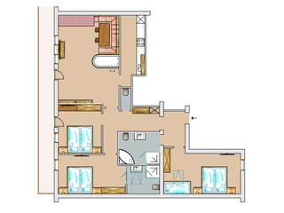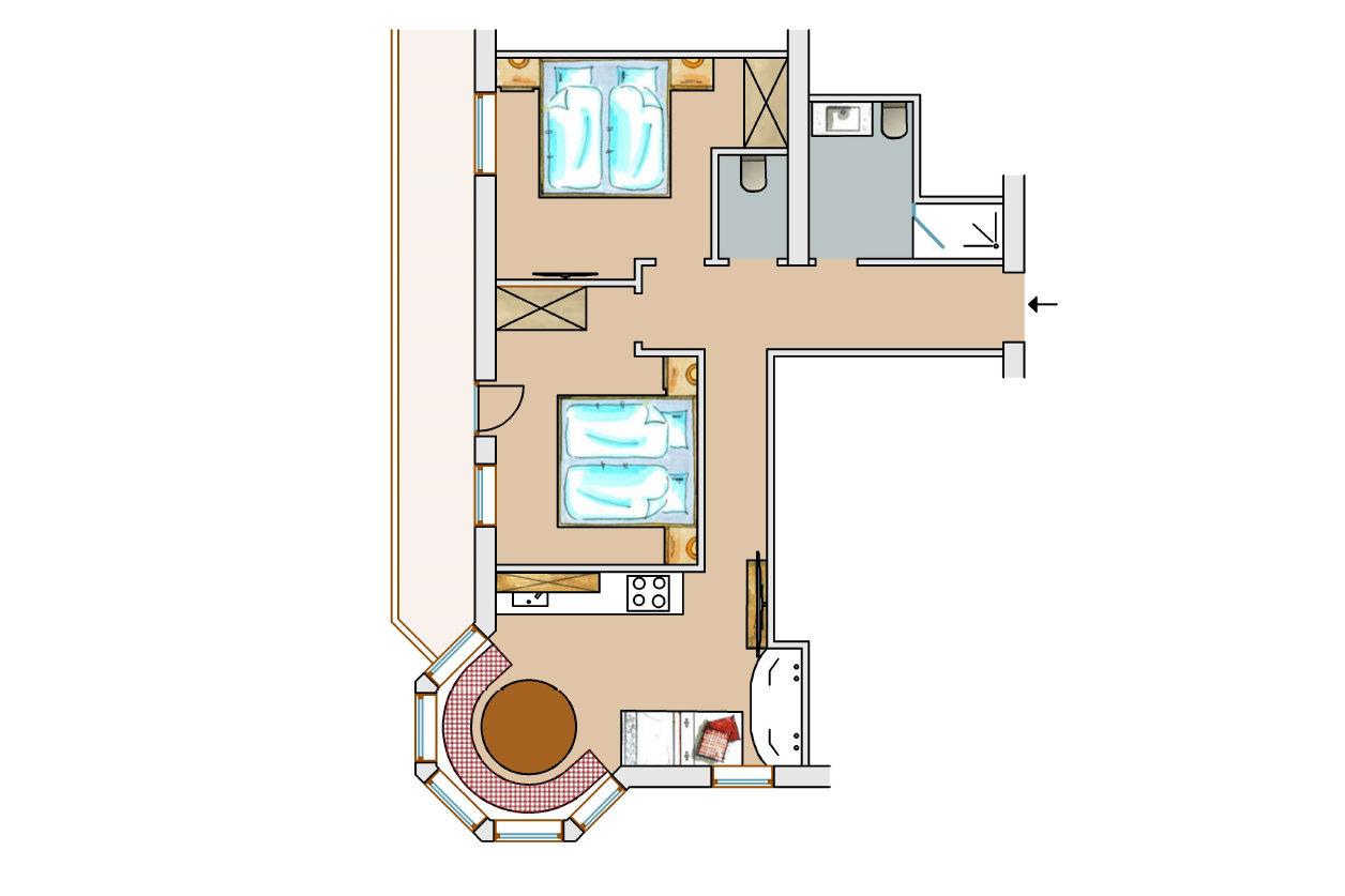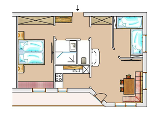 FW4 NEU ab Herbst 2024 Vorraum mit Garderobe Wohnraum mit offener Küche, Sitzecke, Liegesofa ,FlatTV 1Doppelzimmer mit Bad (Dusche, Föhn, Kosmetikspiegel) ,Flat-TV 1Doppelzimmer mit Liegesofa, Bad (Dusche, Föhn, Kosmetikspiegel) getrenntes WC