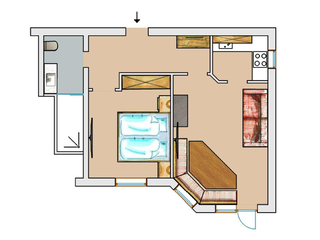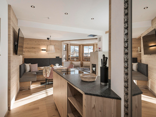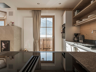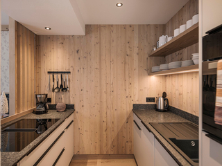 Vorraum mit Garderobe, Wohnzimmer mit offenem Kamin und Flat-TV, Doppelzimmer mit Flat-TV, Küche, Dusche und WC, Die Küche ist voll ausgestattet mit Kaffeemaschine, Geschirrspüler, Backofen, Wasserkocher ...Die Wohnung verfügen ohne Zusatzkosten über