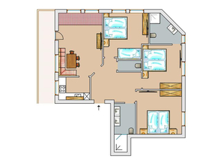 Vorraum mit Garderobe, Wohnzimmer mit gemütlicher Liegewiese,1 Doppelzimmer mit Dusche ,WC und Flat-TV. 1Dreibetzimmer mit Flat -TV, 1 Doppelzimmer mit Flat -TV, 1 gr. Dusche mit WC,1 extra. WC, Die Küche ist voll ausgestattet mit Kaffeemaschine,