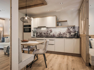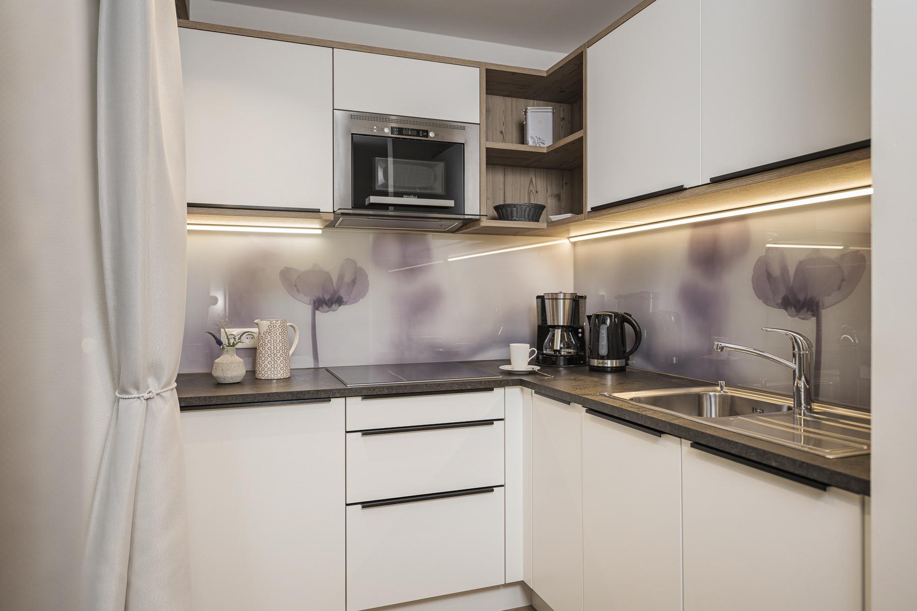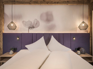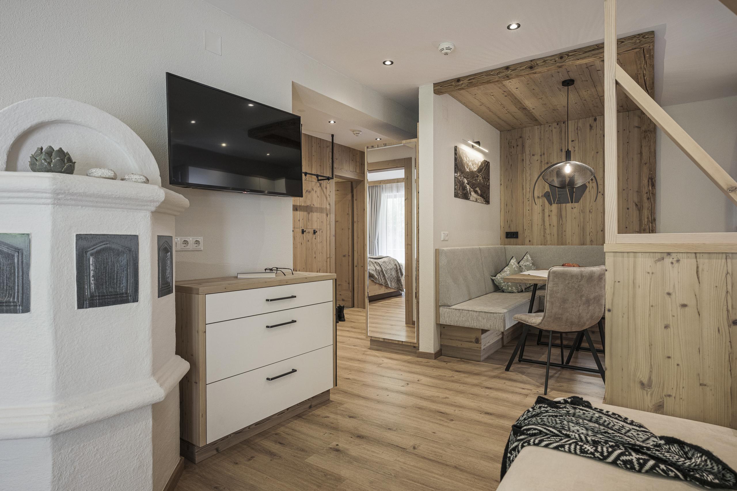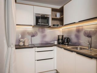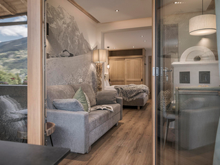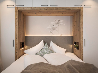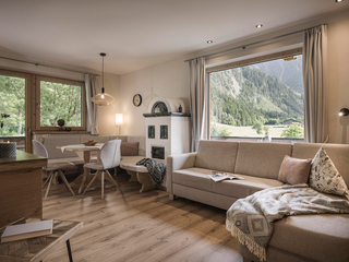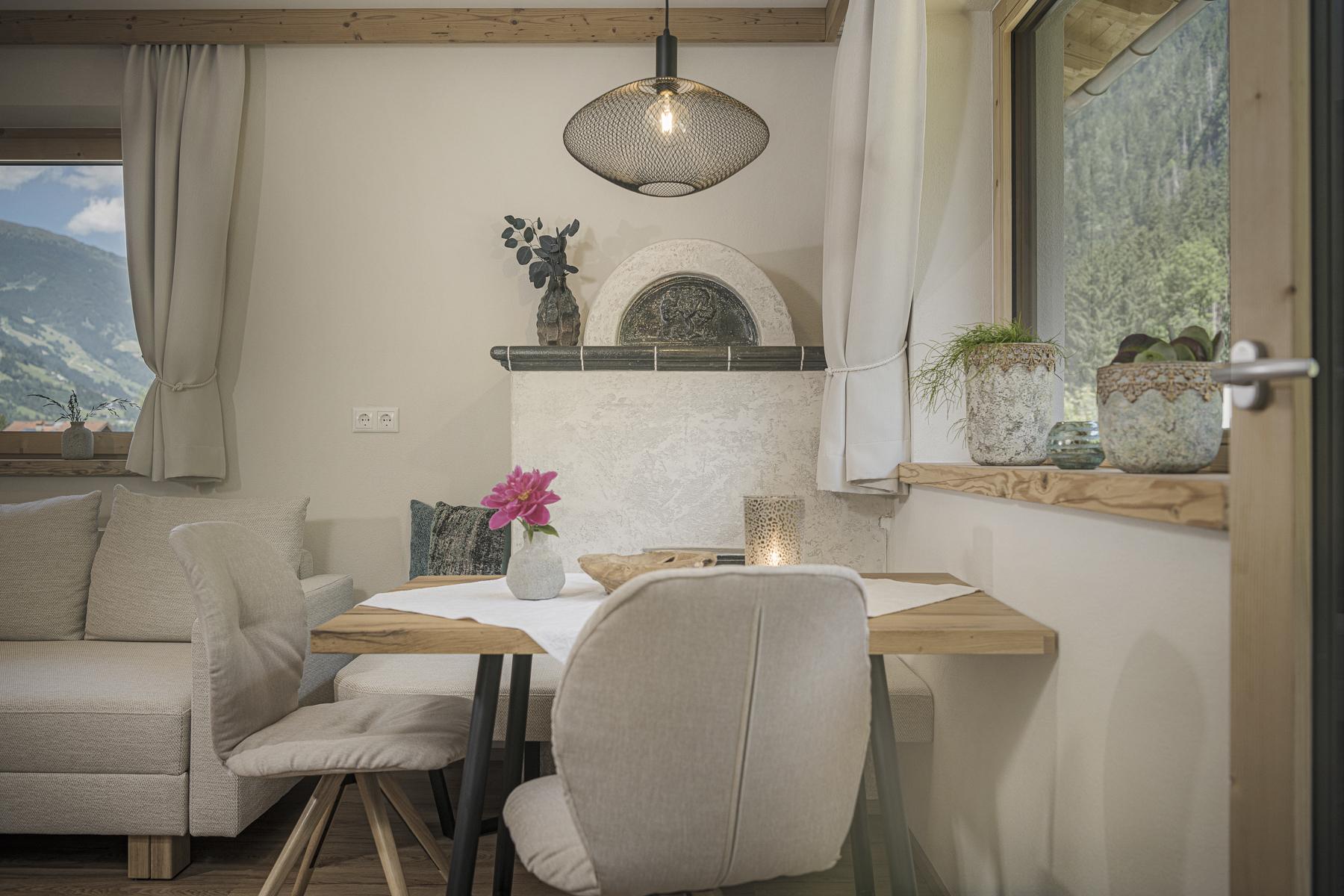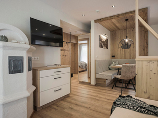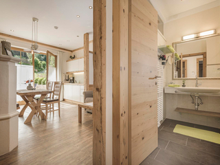 Appartement: Lavendel und Edelweiß: für 4 Personen (ca. 60m²). 2 Schlafzimmer, Wohnzimmer mit Kachelofen, Sitzecke und Liegesofa, Küche komplett eingerichtet (Mikrogrill, Geschirrspüler ...), Vorraum mit Garderobe, 2x Dusche/WC, Balkon Richtung Westen