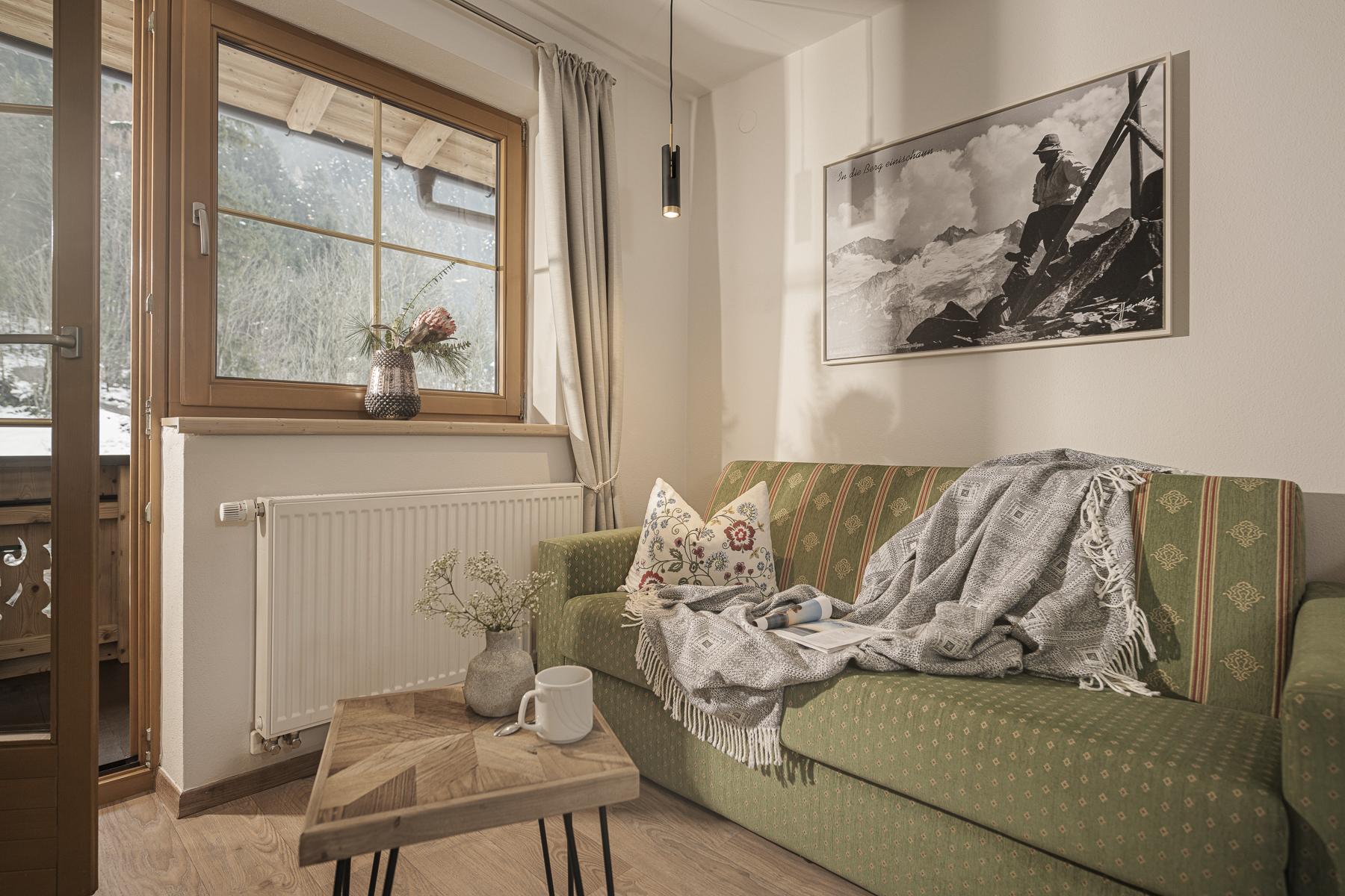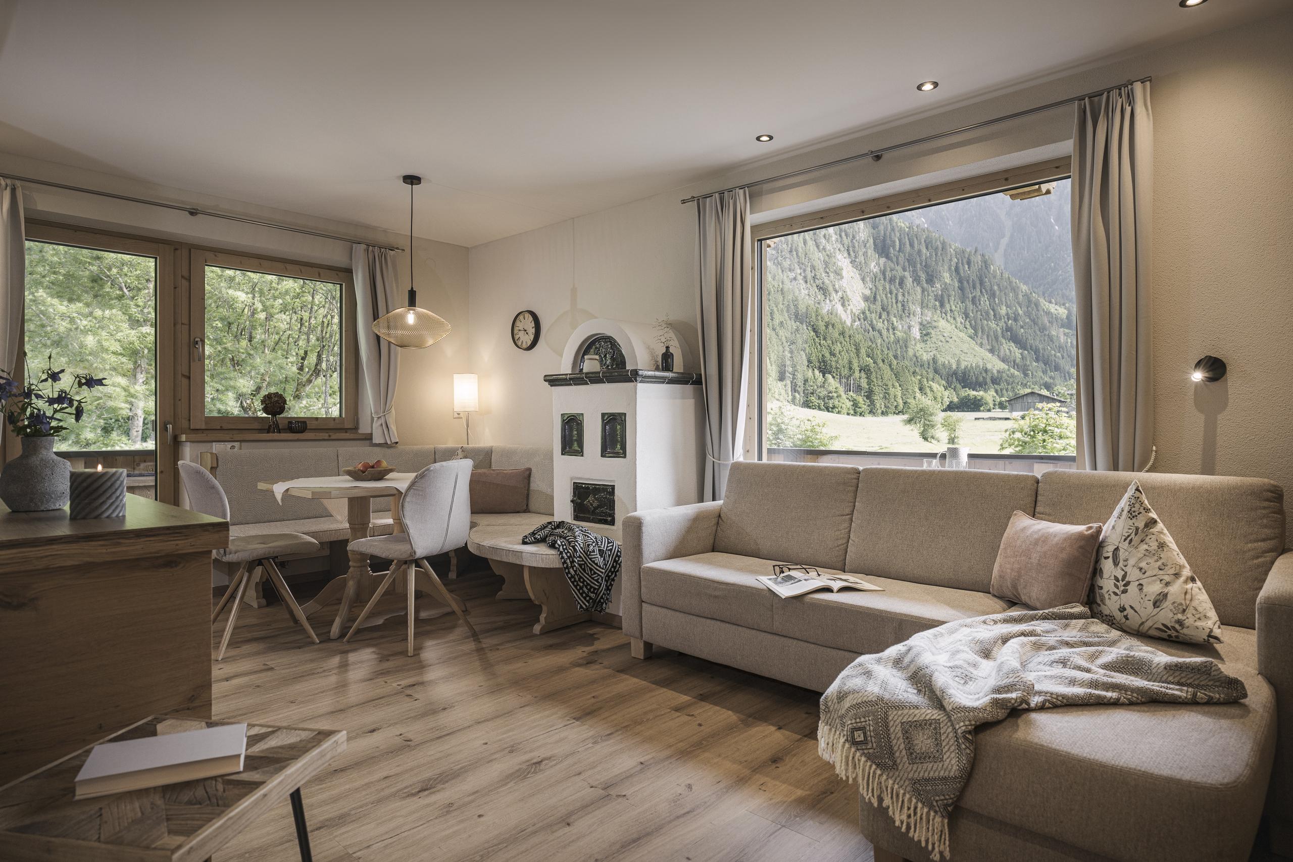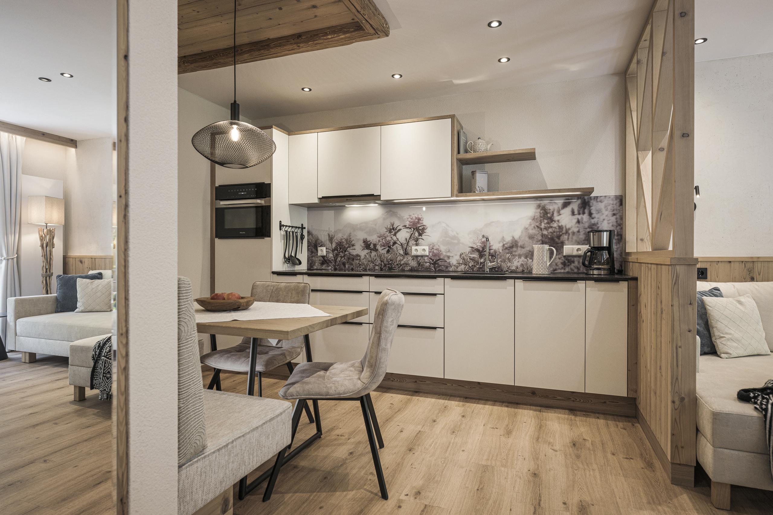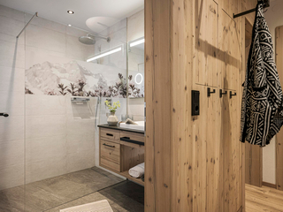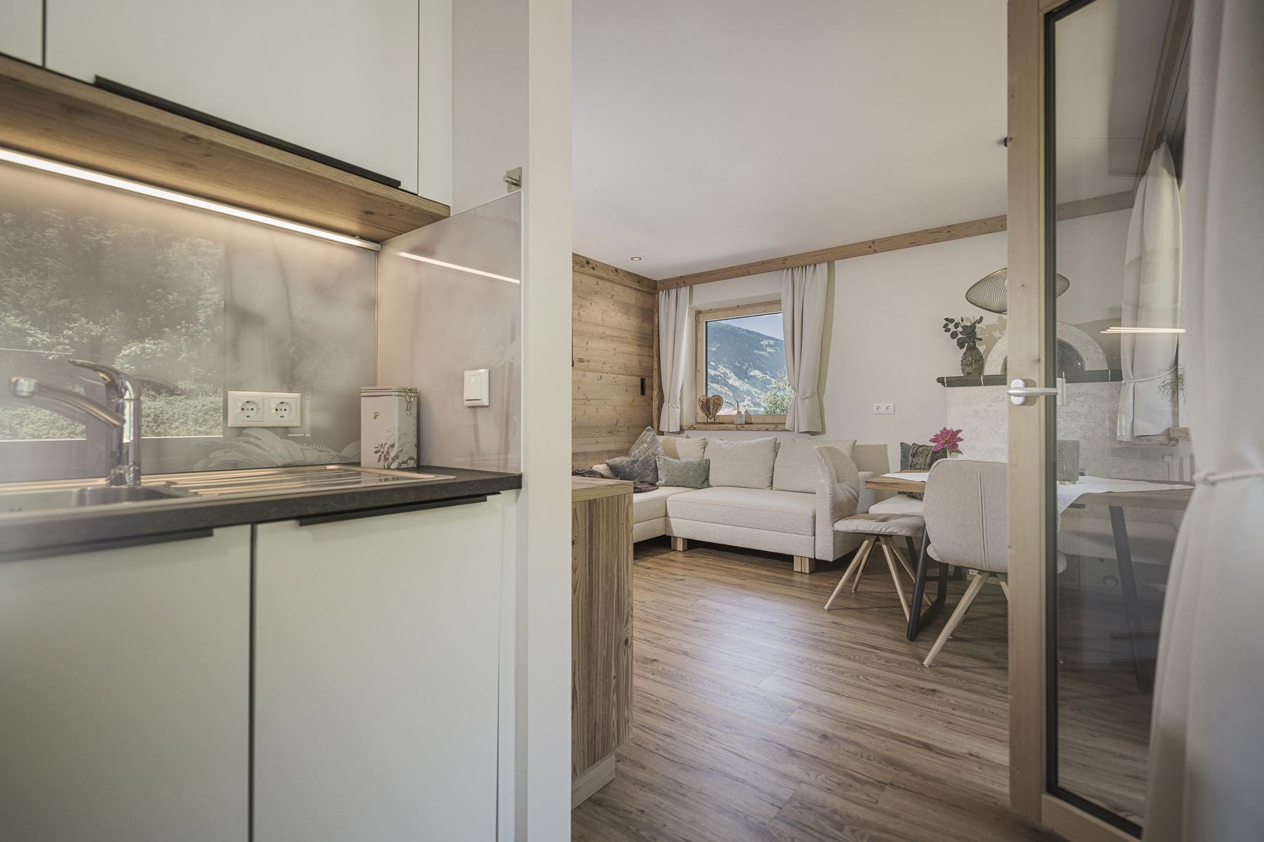 Appartement: Lavendel und Edelweiß: für 4 Personen (ca. 60m²). 2 Schlafzimmer, Wohnzimmer mit Kachelofen, Sitzecke und Liegesofa, Küche komplett eingerichtet (Mikrogrill, Geschirrspüler ...), Vorraum mit Garderobe, 2x Dusche/WC, Balkon Richtung Westen