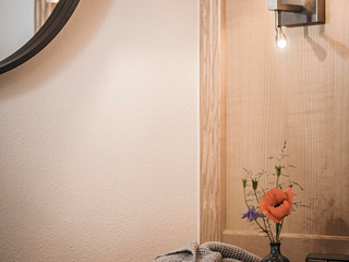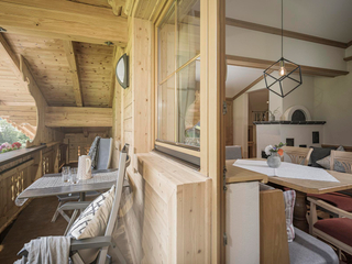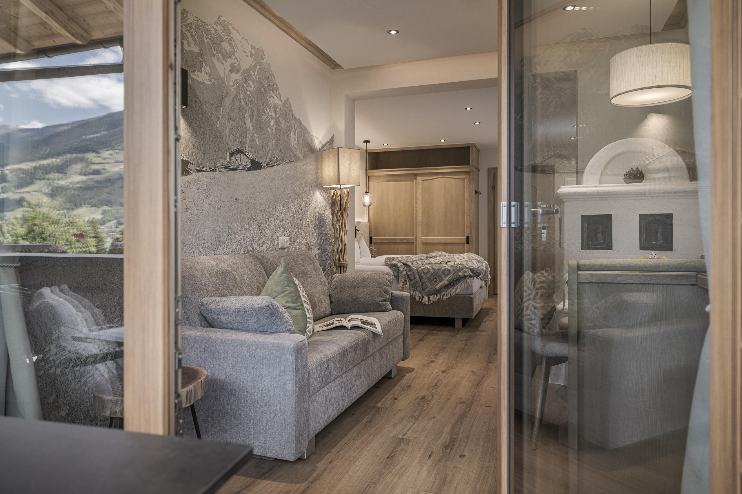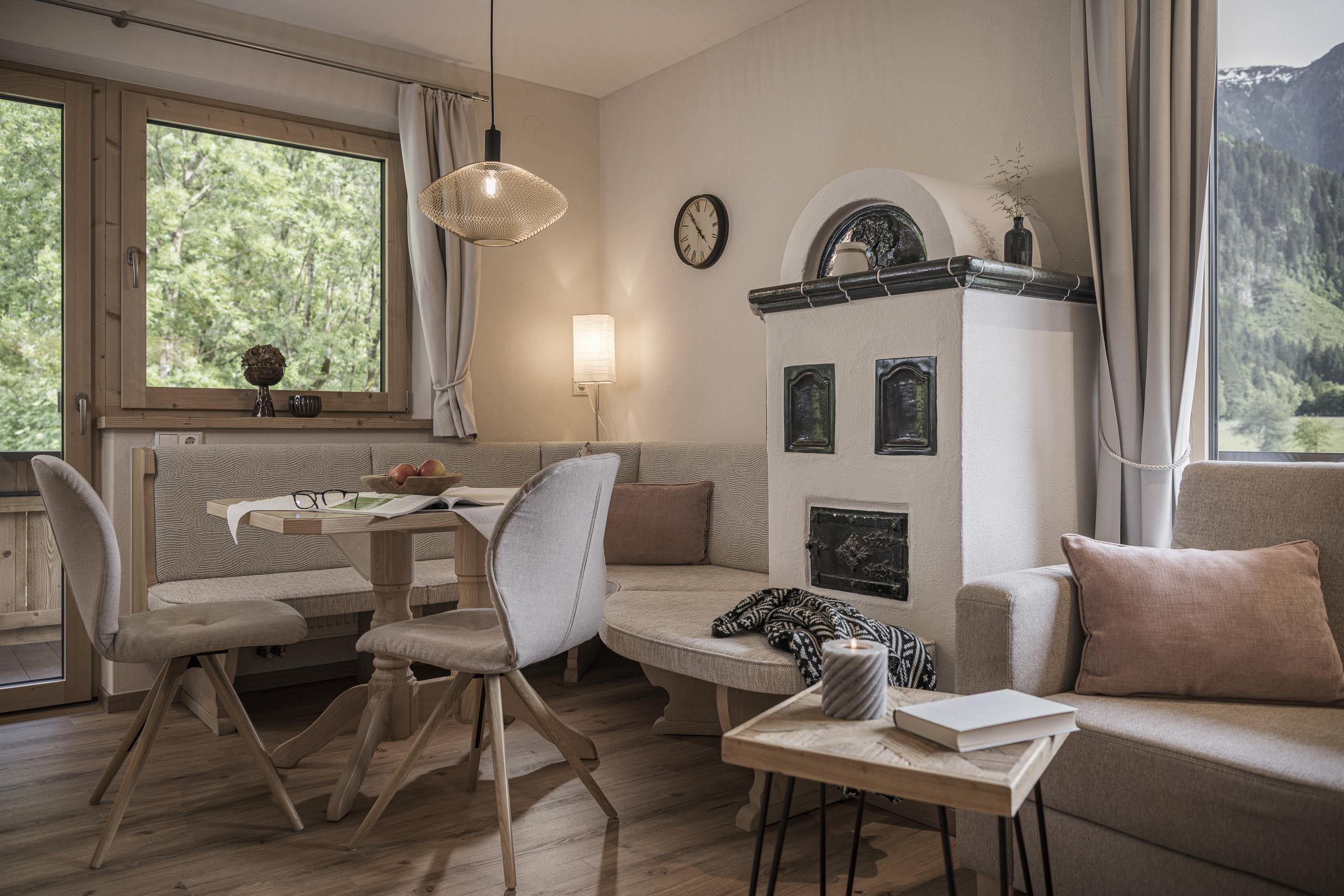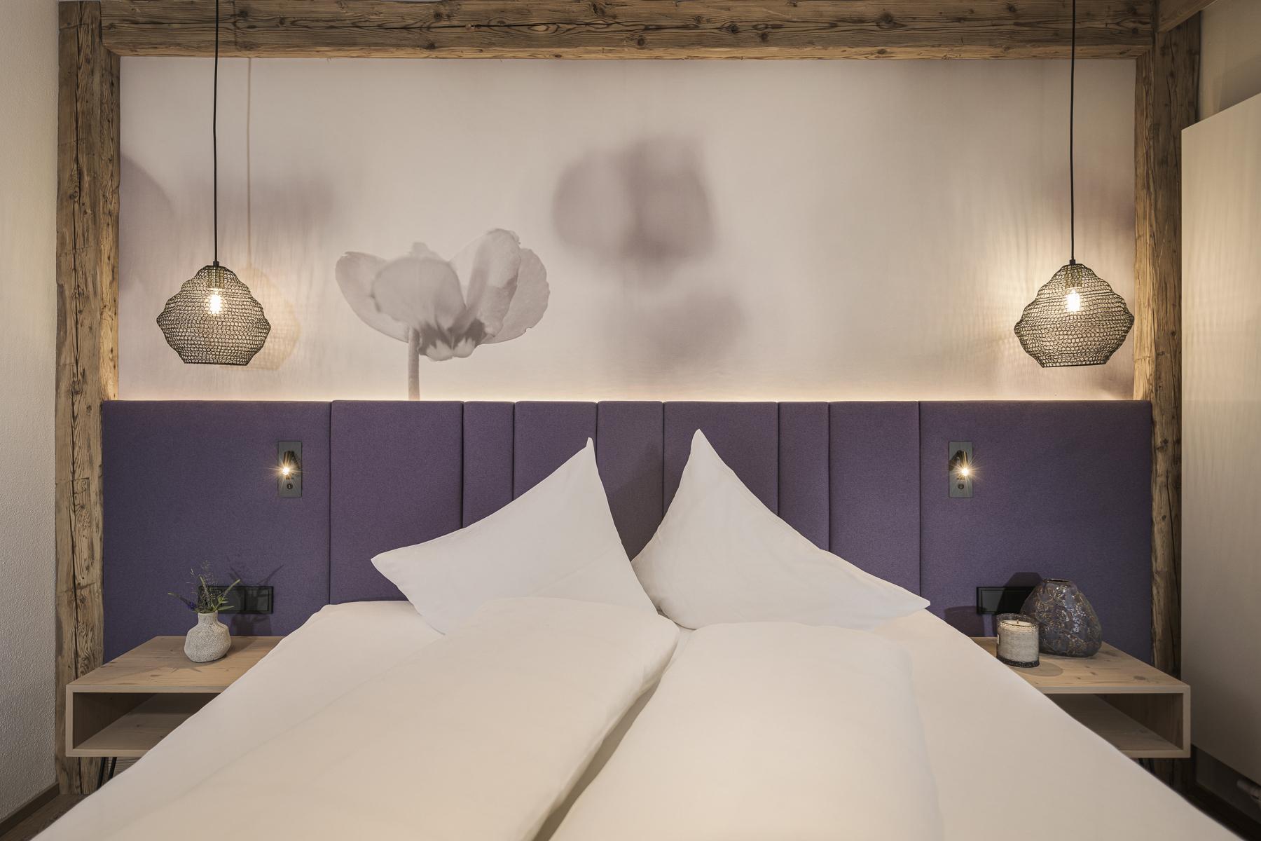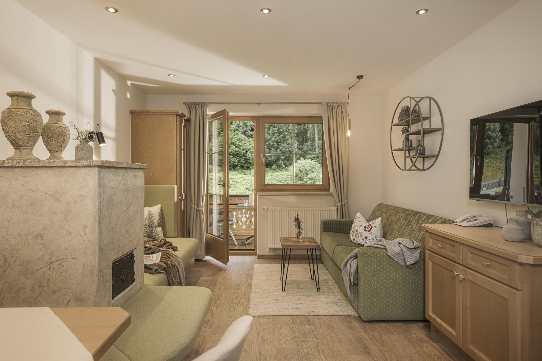 Appartement: Lavendel und Edelweiß: für 4 Personen (ca. 60m²). 2 Schlafzimmer, Wohnzimmer mit Kachelofen, Sitzecke und Liegesofa, Küche komplett eingerichtet (Mikrogrill, Geschirrspüler ...), Vorraum mit Garderobe, 2x Dusche/WC, Balkon Richtung Westen
