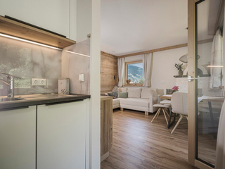Studio Himmelschlüssel: für 2 Pers. (ca. 38m²). Schlafzimmer, Wohnbereich mit Kachelofen, Sitzecke und Sofa, Küche komplett eingerichtet (Mikrogrill, Geschirrspüler...), Dusche/WC, Balkon Richtung Westen, SAT-TV, Radio, Telefon und Safe.