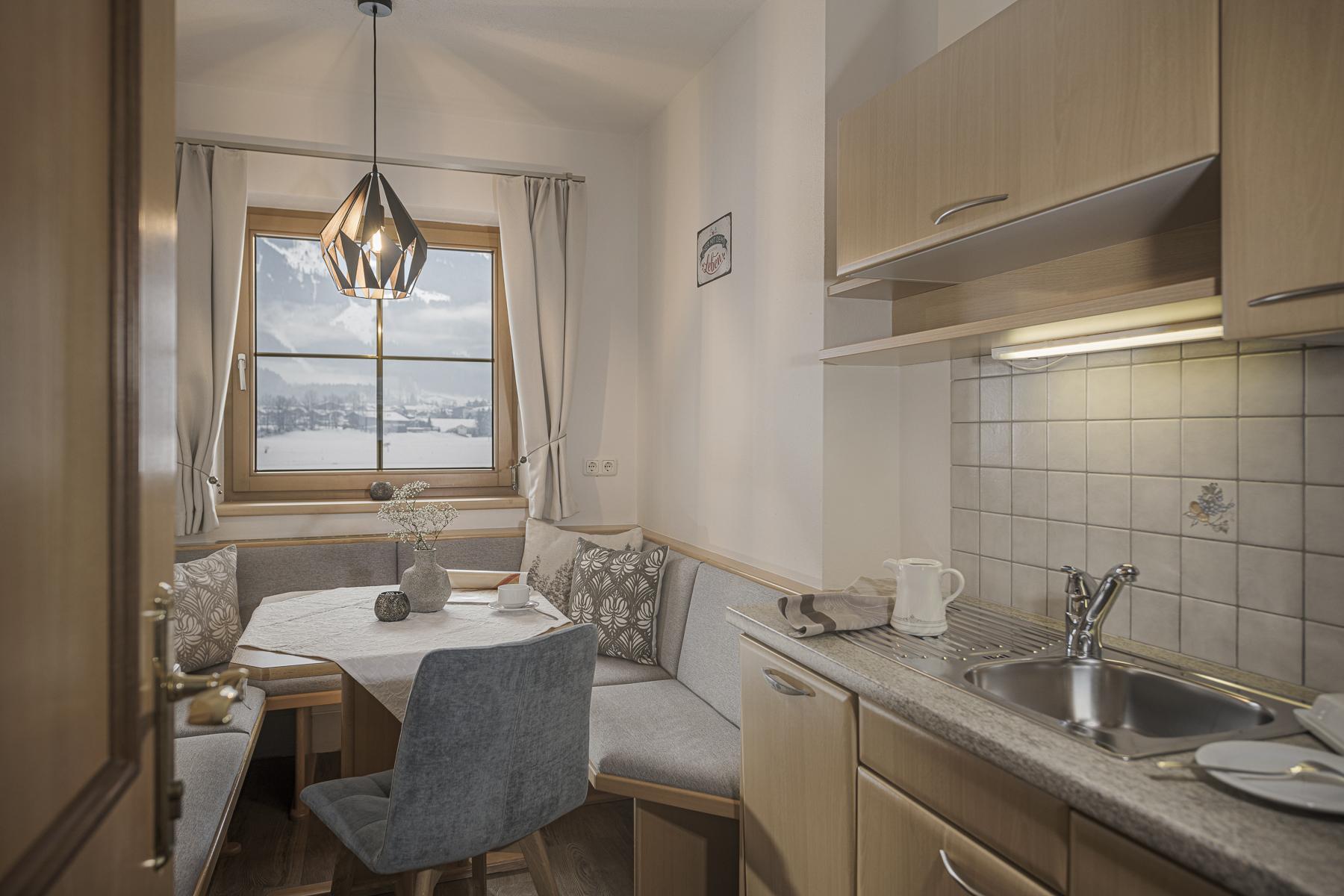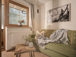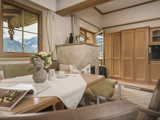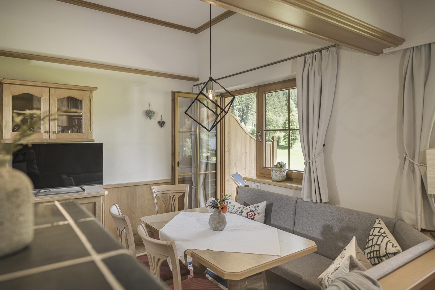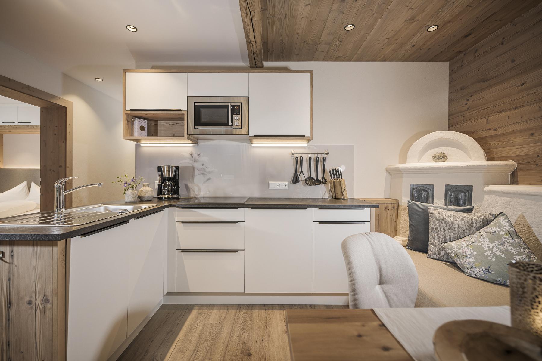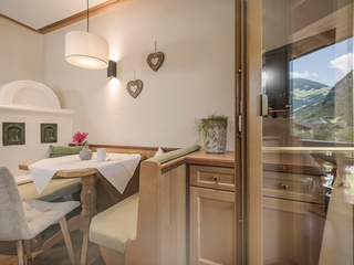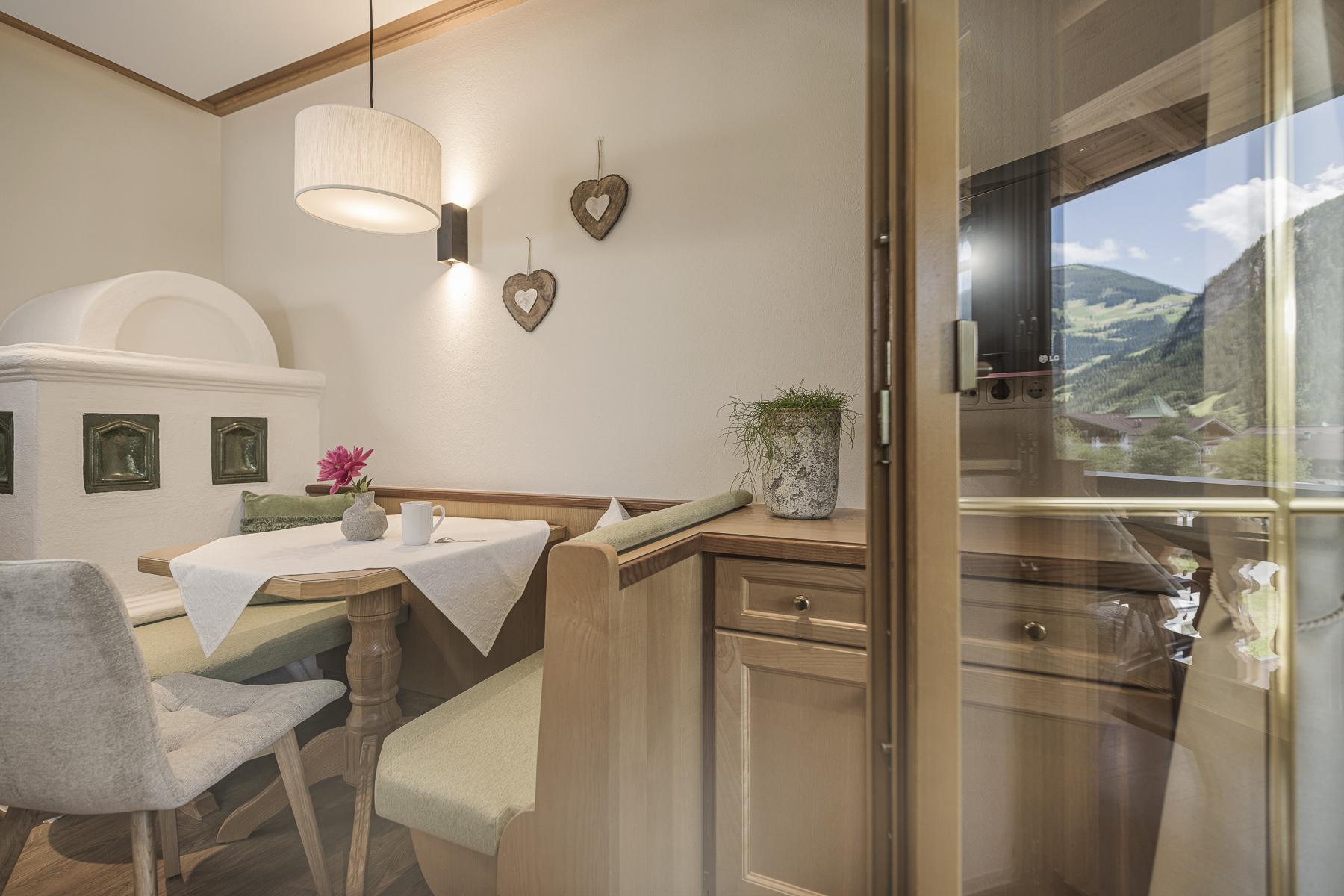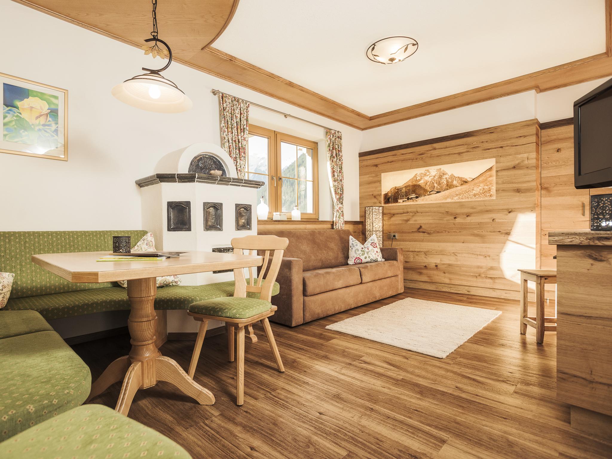 Appartement: Alpenrose und Vergissmeinnicht: für 2-4 Pers. (ca. 55m²): Schlafzimmer, Wohnzimmer mit Kachelofen, Sitzecke und ausziehbares Liegesofa, Küche komplett eingerichtet (Mikrogrill, Geschirrspüler ...), Bad oder Dusche, WC separat, Vorraum mit