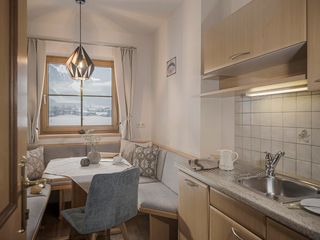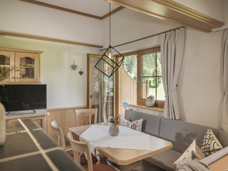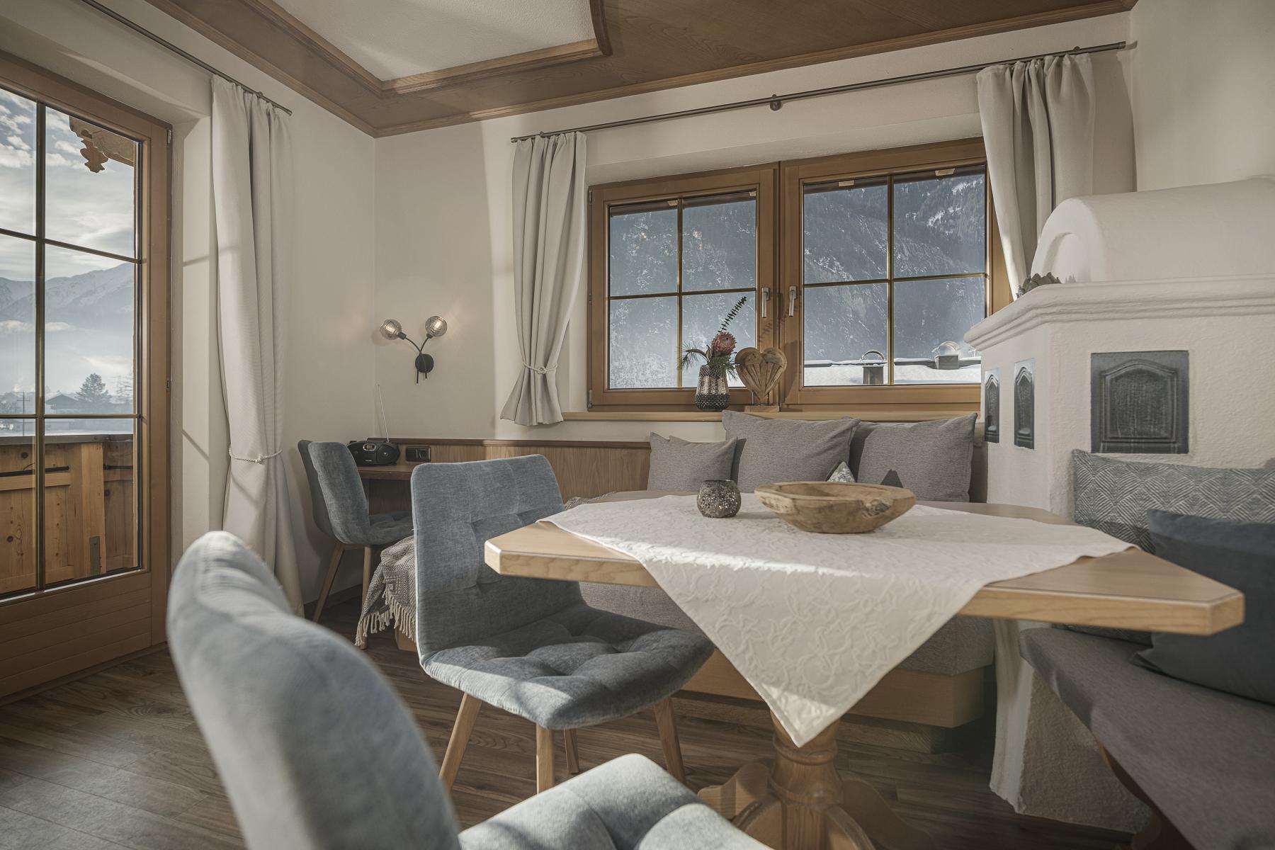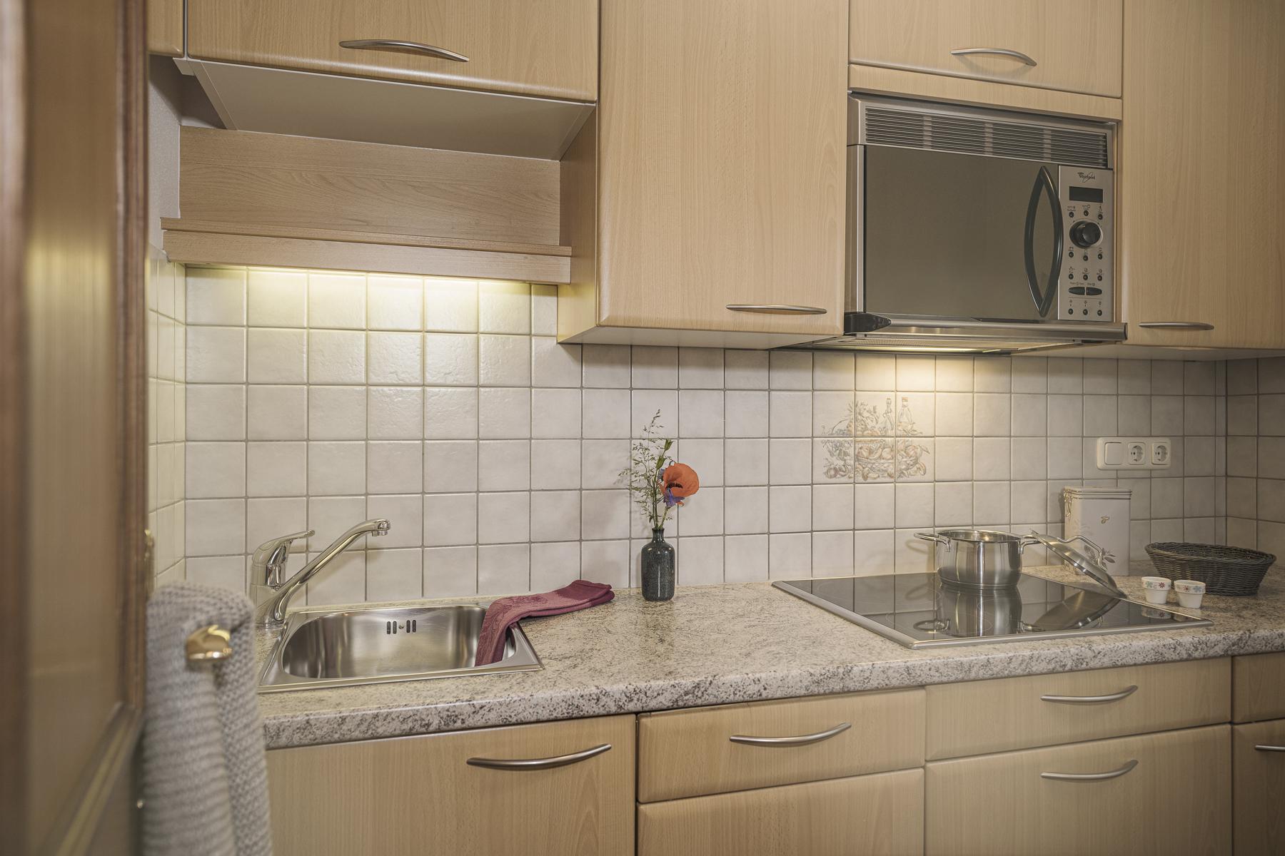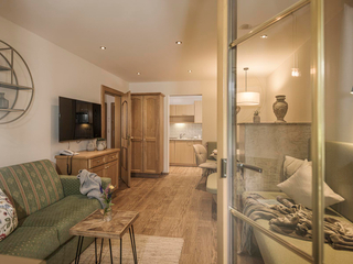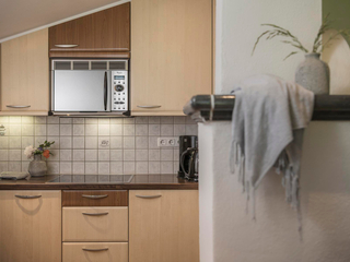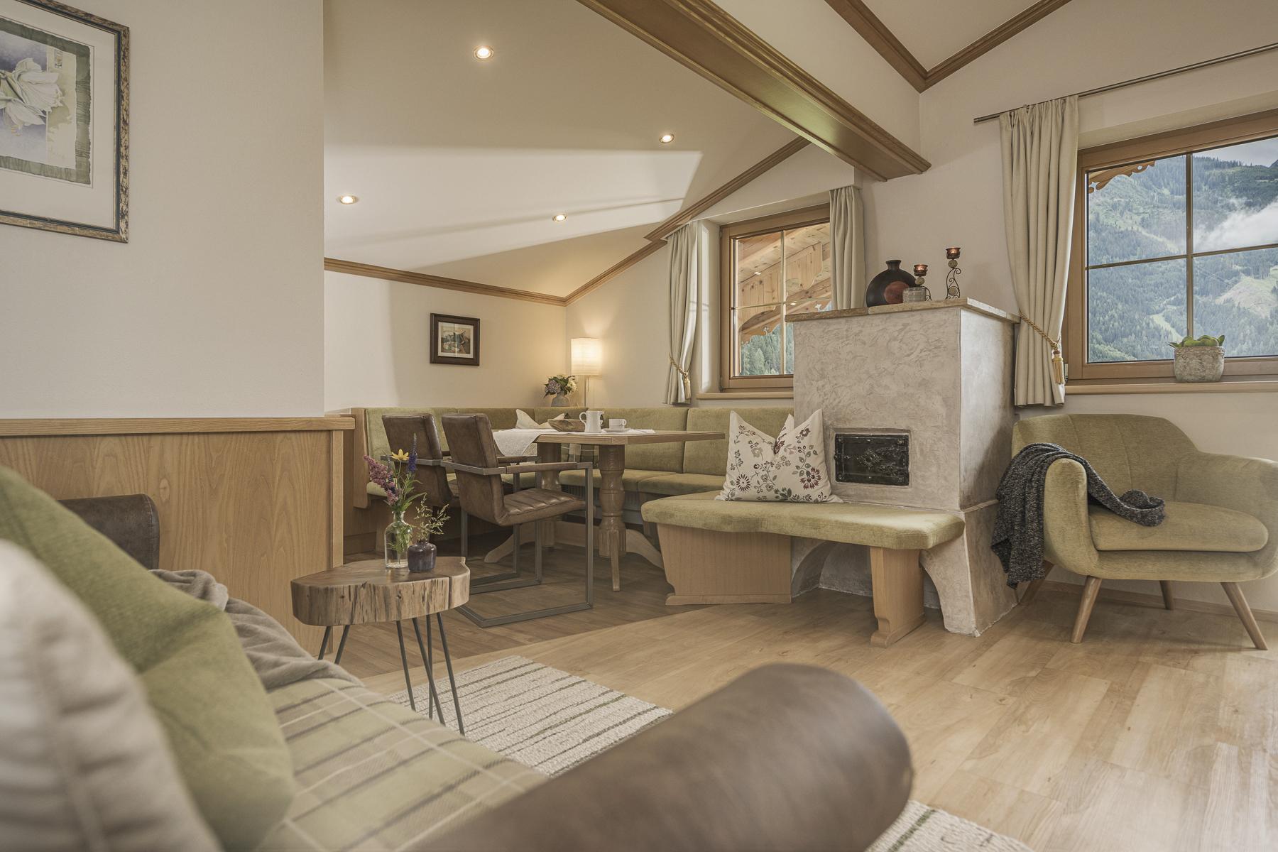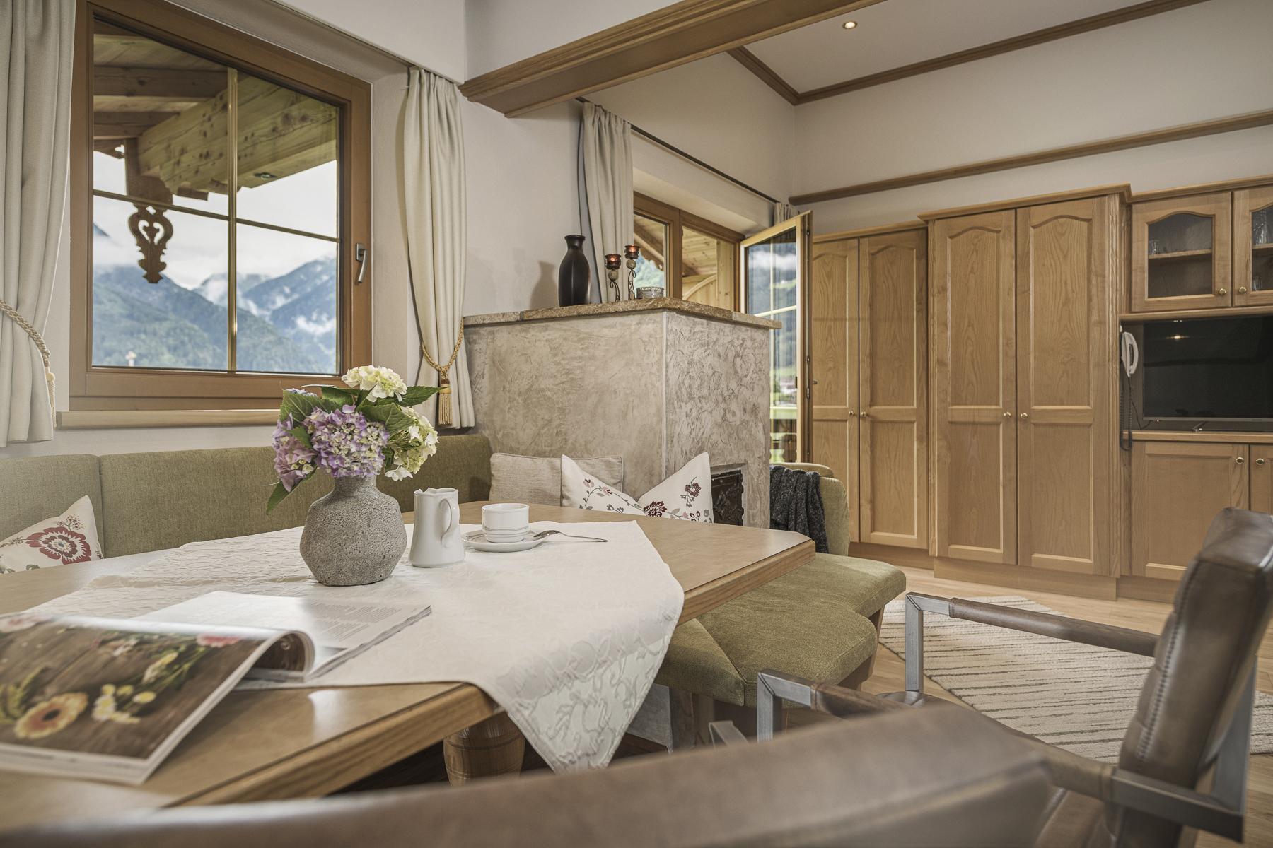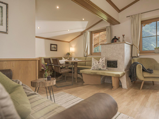 Appartement: Alpenrose und Vergissmeinnicht: für 2-4 Pers. (ca. 55m²): Schlafzimmer, Wohnzimmer mit Kachelofen, Sitzecke und ausziehbares Liegesofa, Küche komplett eingerichtet (Mikrogrill, Geschirrspüler ...), Bad oder Dusche, WC separat, Vorraum mit