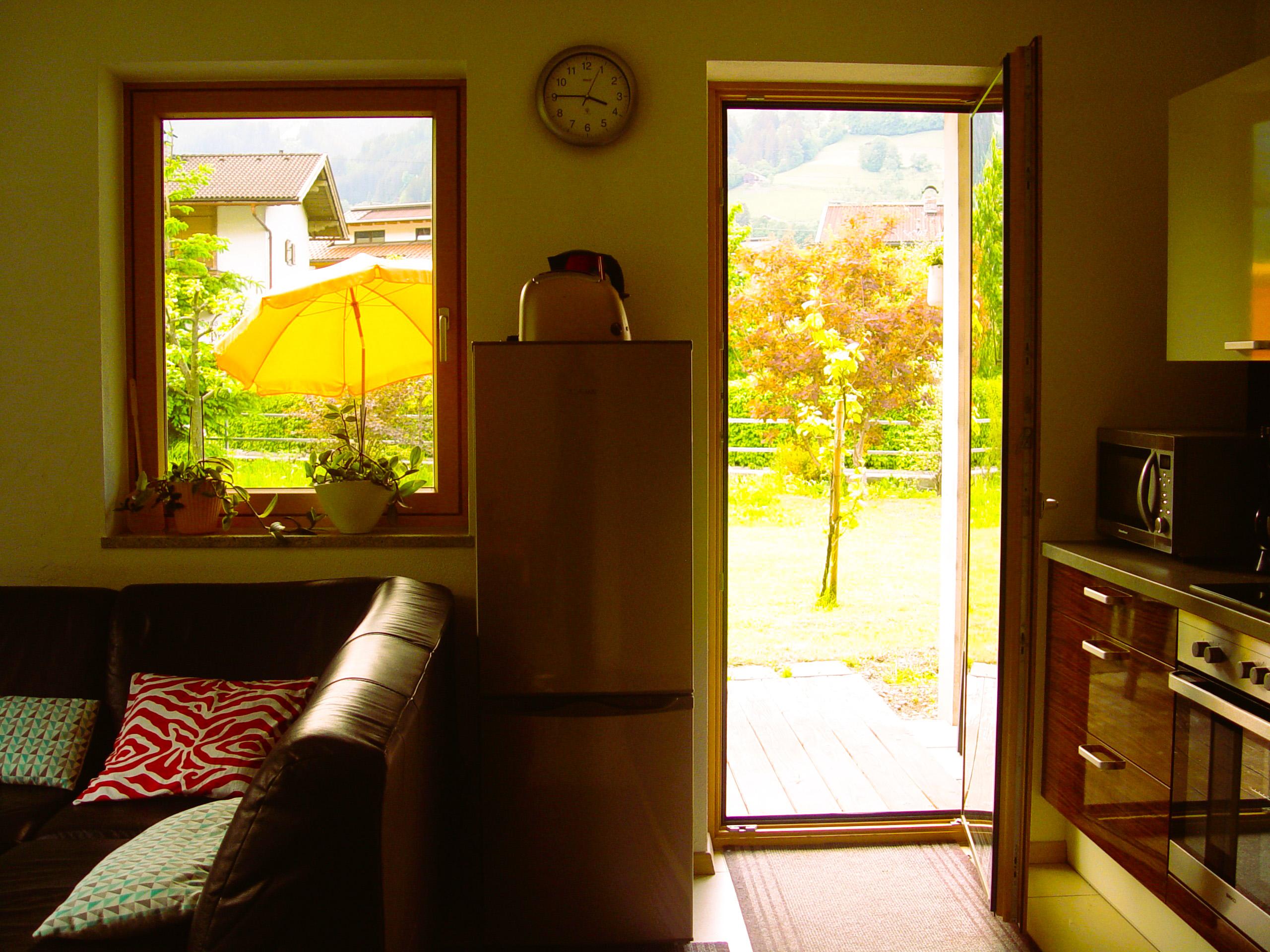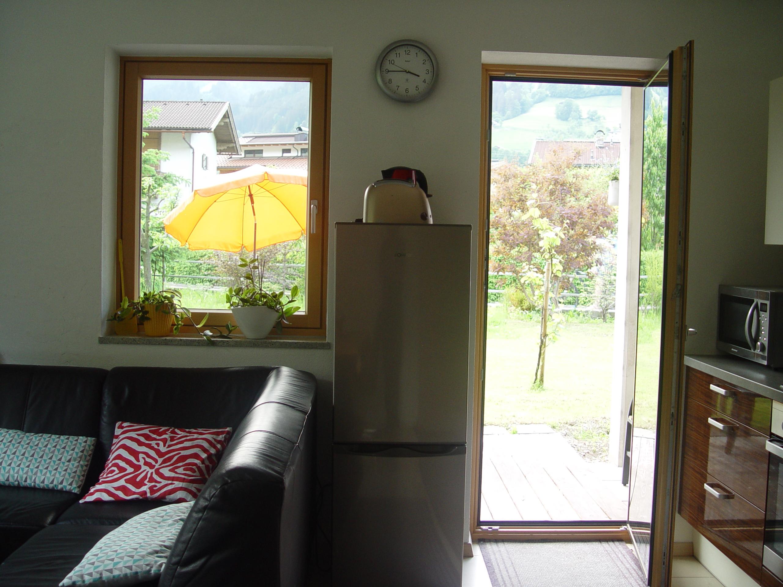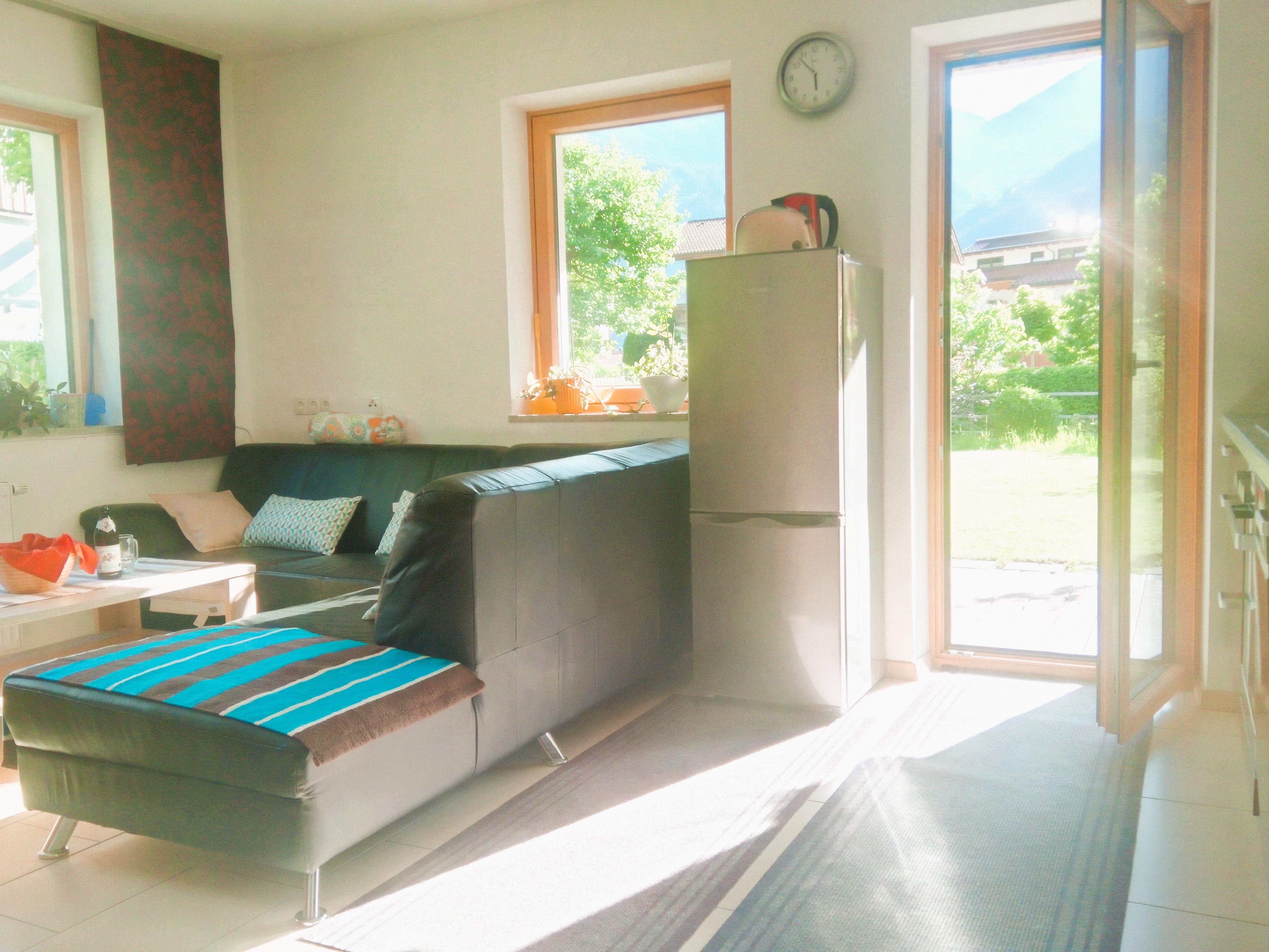 Das Appartement hat 2 Schlafzimmer und eine Wohnküche. Alle 3 Zimmer haben direkten Zugang in den Garten. In der Wohnküche gibt es eine Küchenzeile, einen Esstisch für 4 Personen sowie eine gemütliche Sitzecke.