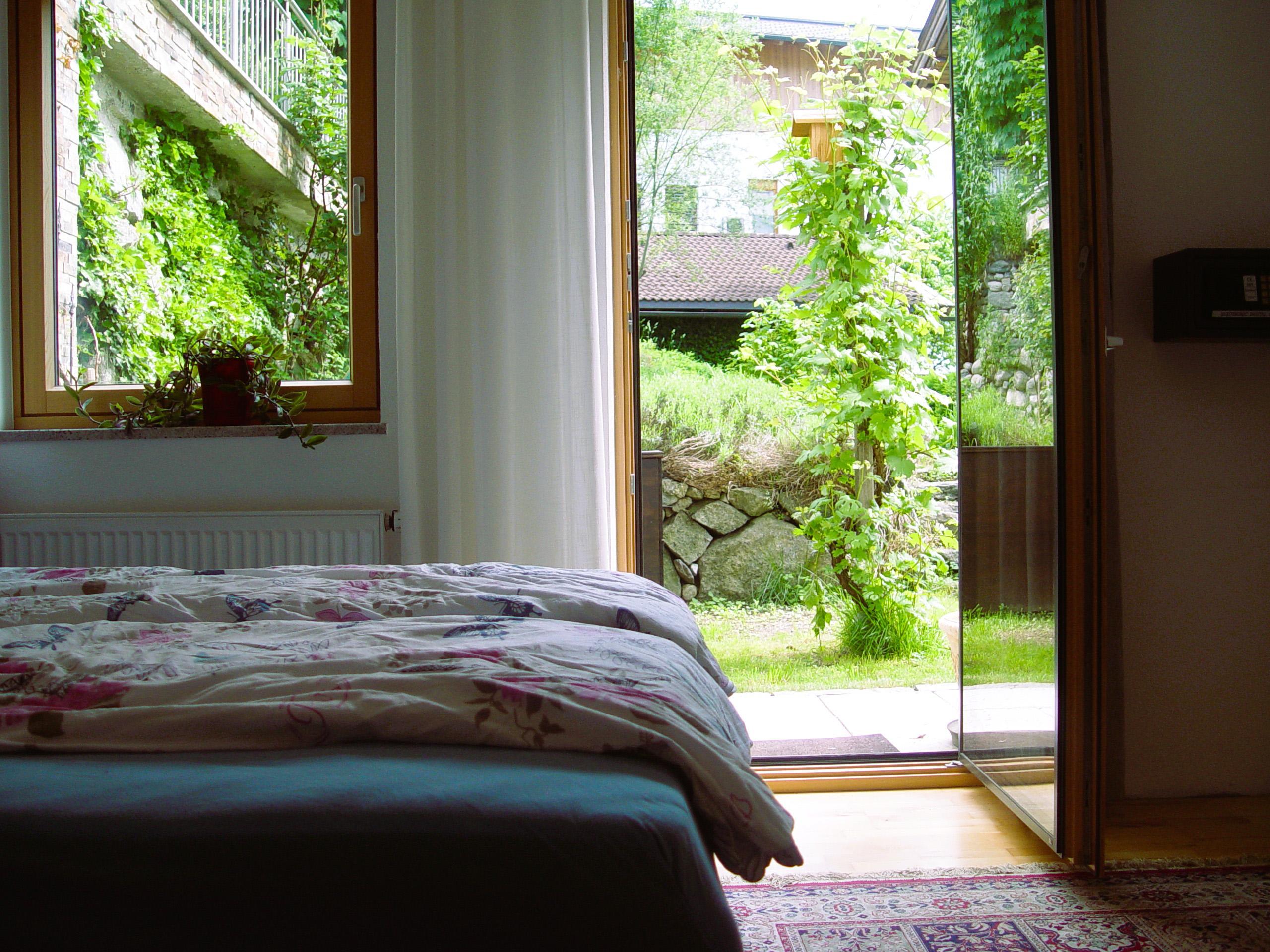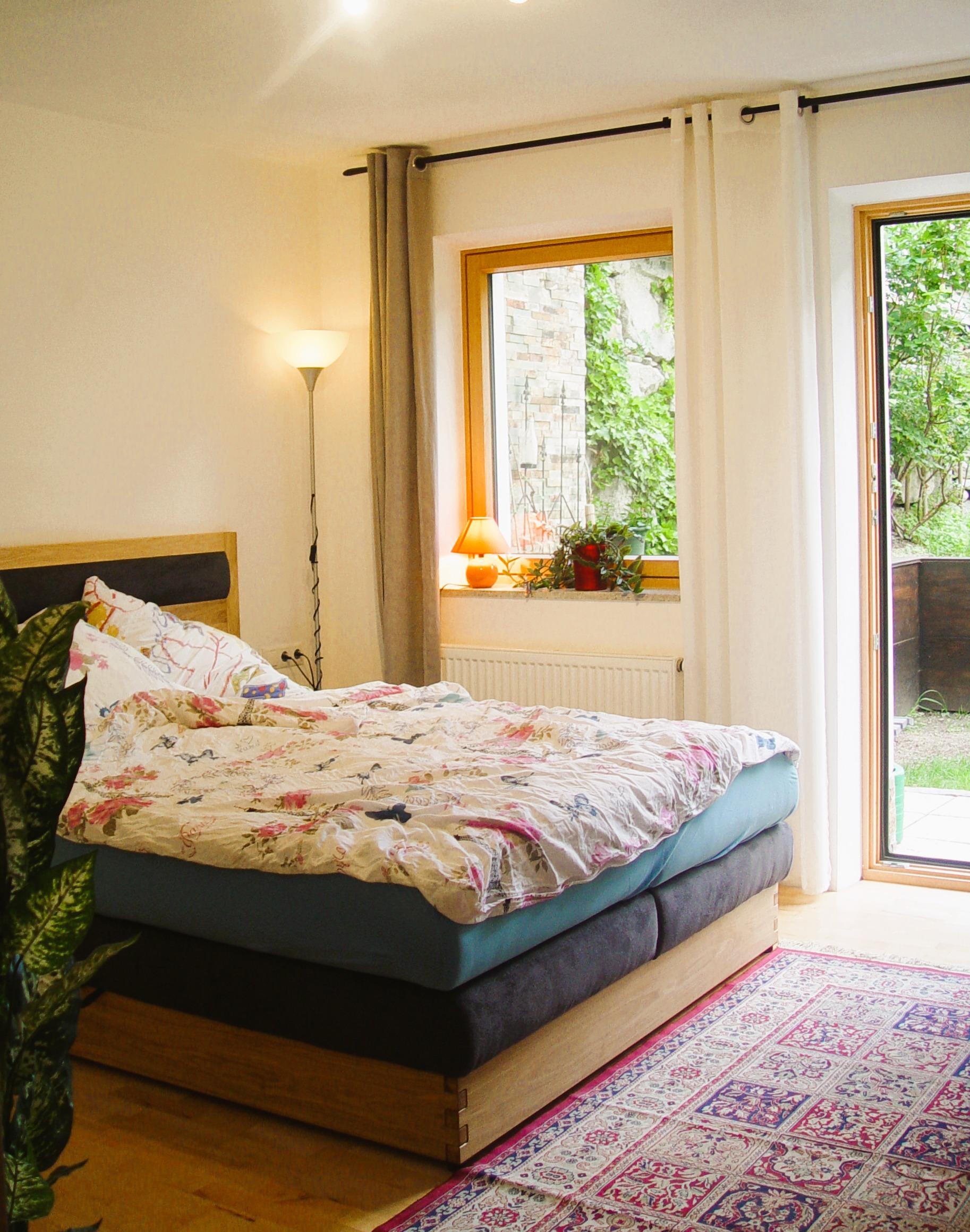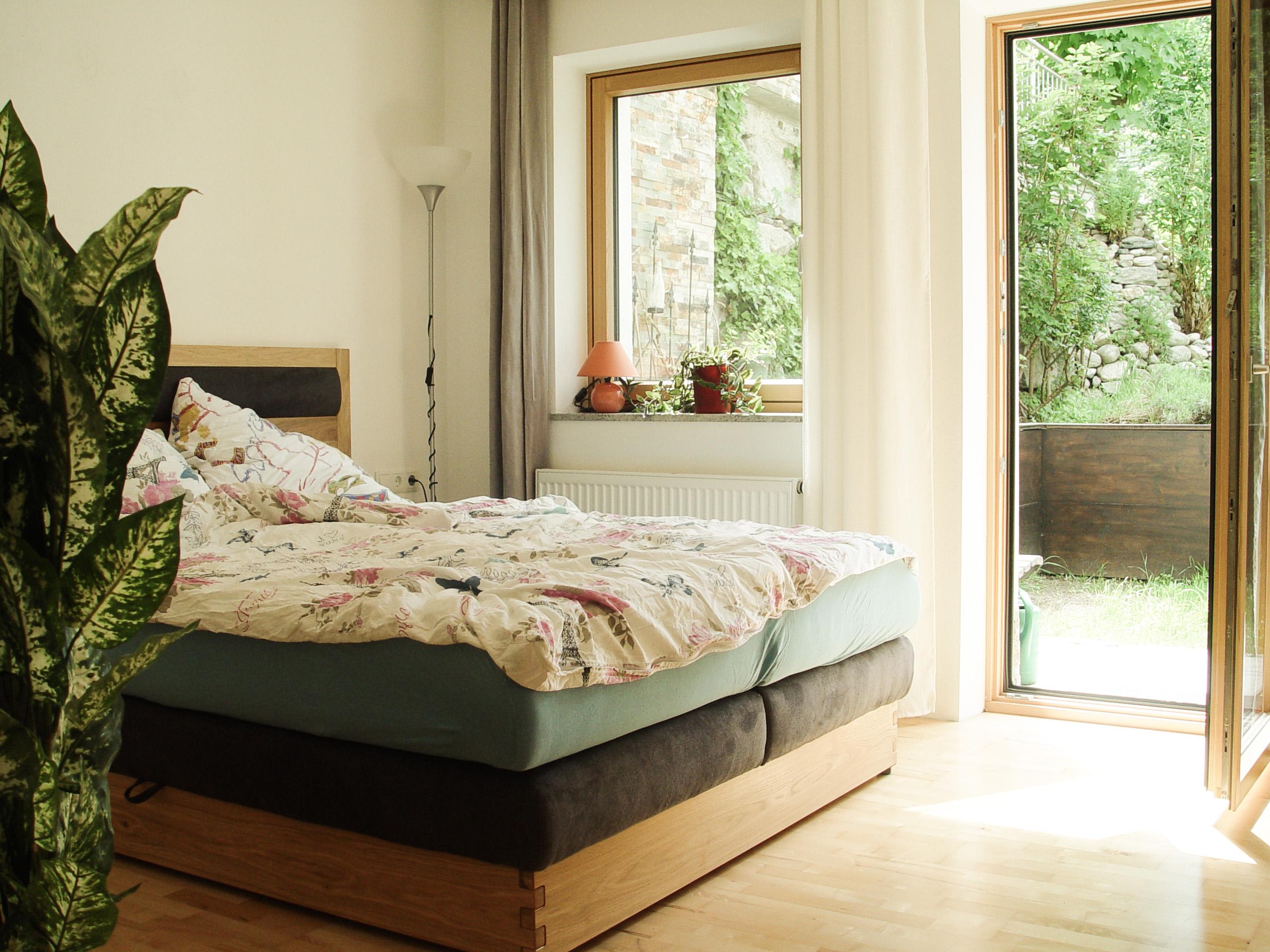Das Appartement hat 2 Schlafzimmer und eine Wohnküche. Alle 3 Zimmer haben direkten Zugang in den Garten. In der Wohnküche gibt es eine Küchenzeile, einen Esstisch für 4 Personen sowie eine gemütliche Sitzecke.