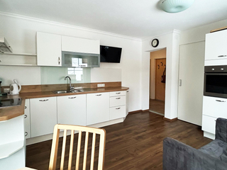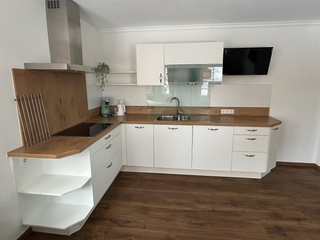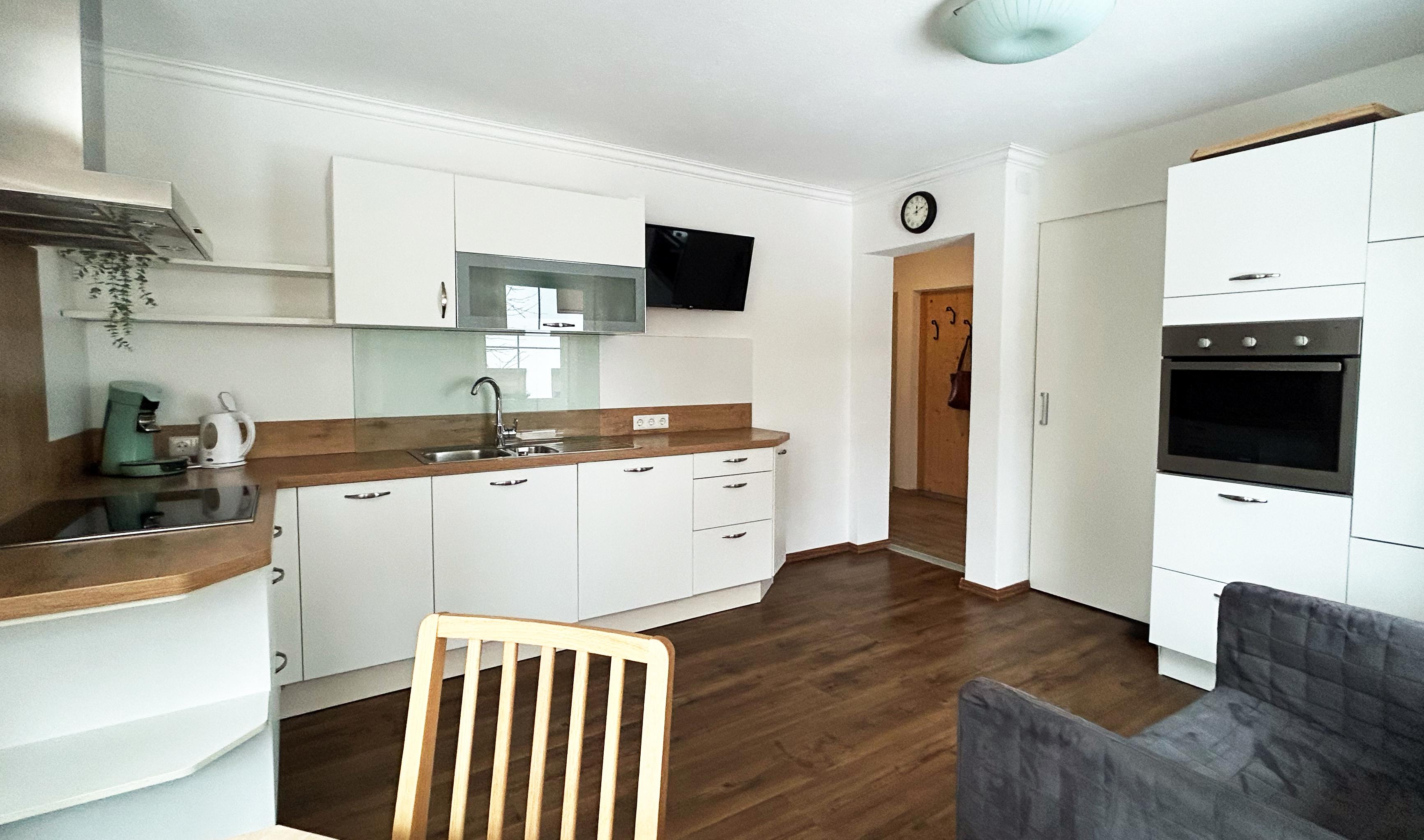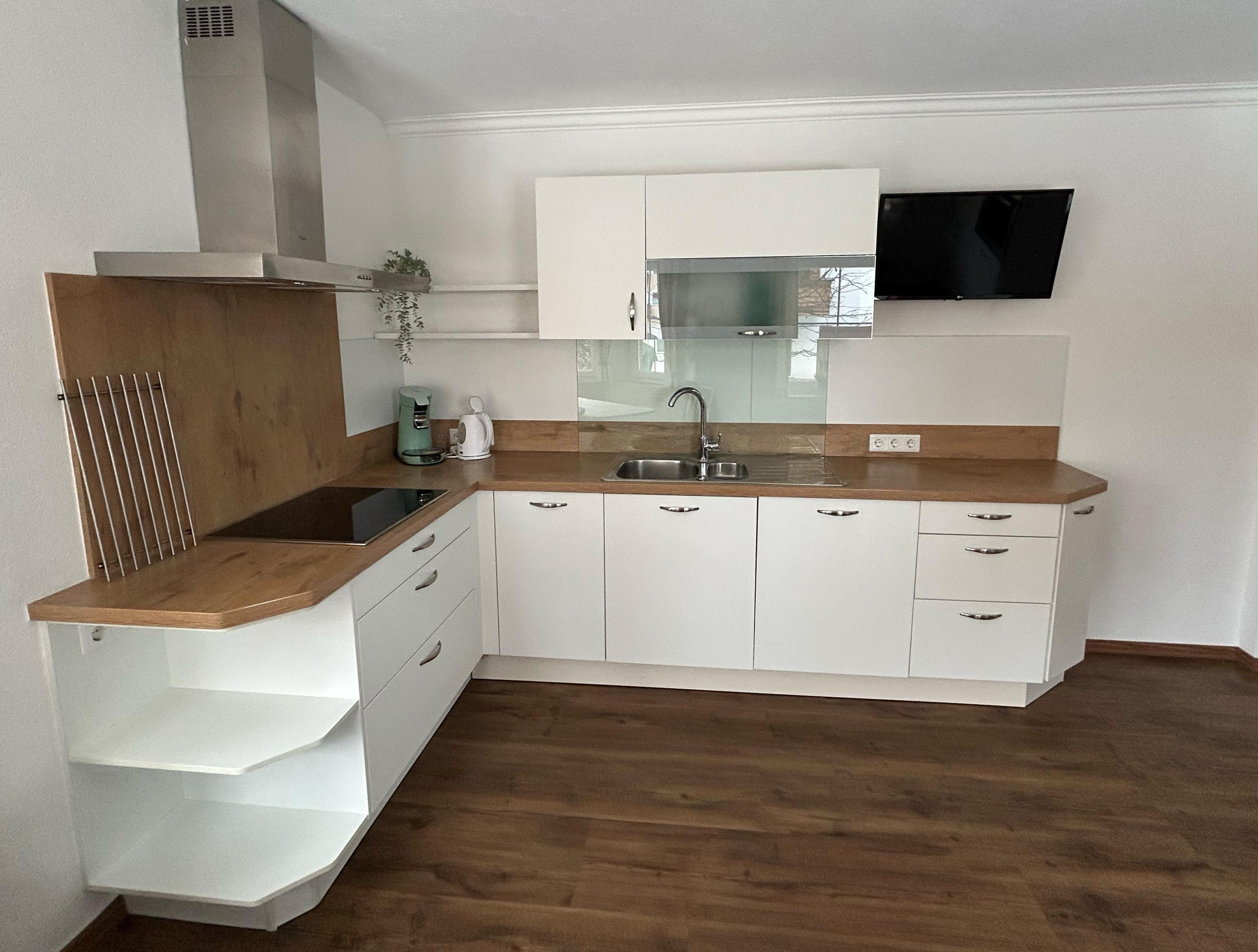 Wohnküche: Herd, Backofen, Kühlschrank, Geschirrspüler, Toaster, Wasserkocher, Kaffeemaschine, Sitzecke, TV