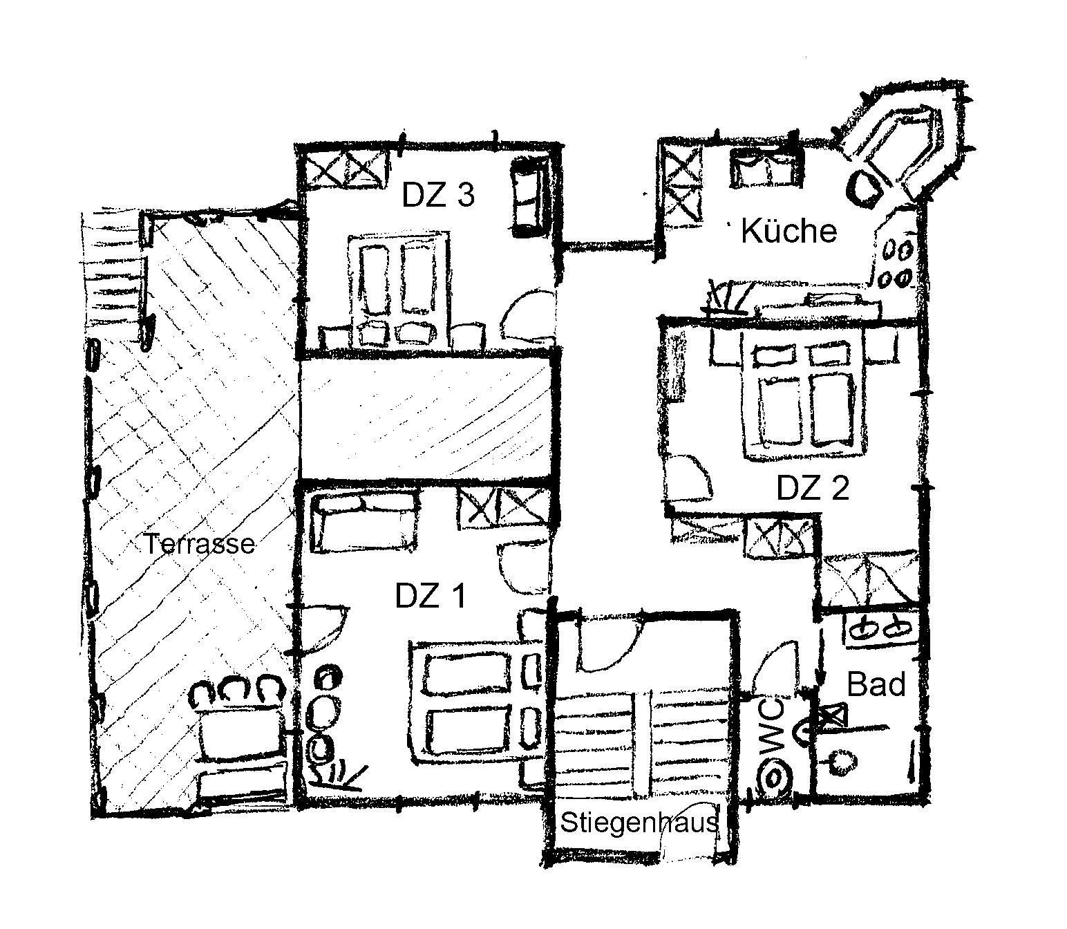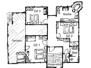 Das 75 m2 große Appartement Schneeflöckchen 1 befindet sich im Erdgeschoss und verfügt über 3 Schlafzimmer mit jeweils einem Doppelbett. Doppelzimmer 1: zusätzliche Schlafcouch buchbar, TV, Ausgang Terrasse Bad: Doppelwaschtisch und Dusche.