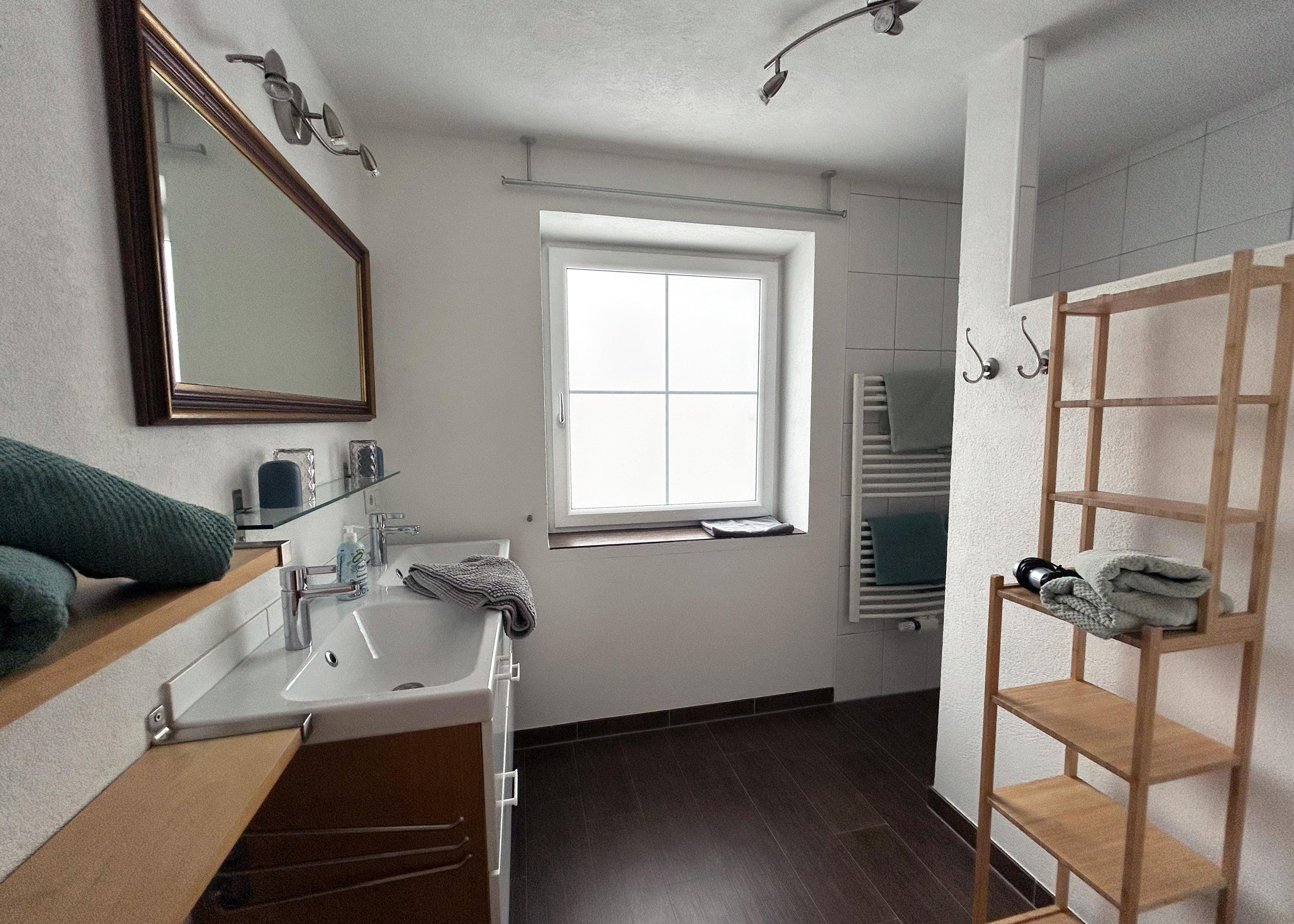 Bad: Doppelwaschtisch und Dusche.