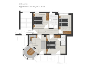 Ferienwohnung Morgensonne In diesem Appartement finden Sie eine große Wohnküche mit Erker und ausziehbarer Schlafcouch, 3 Schlafzimmer sowie 2 Badezimmer. WLAN und SAT TV sind vorhanden. Die Ferienwohnung Morgensonne ist komfortabel und gemütlich