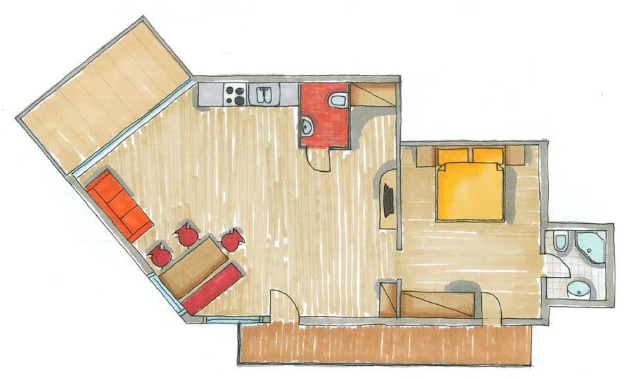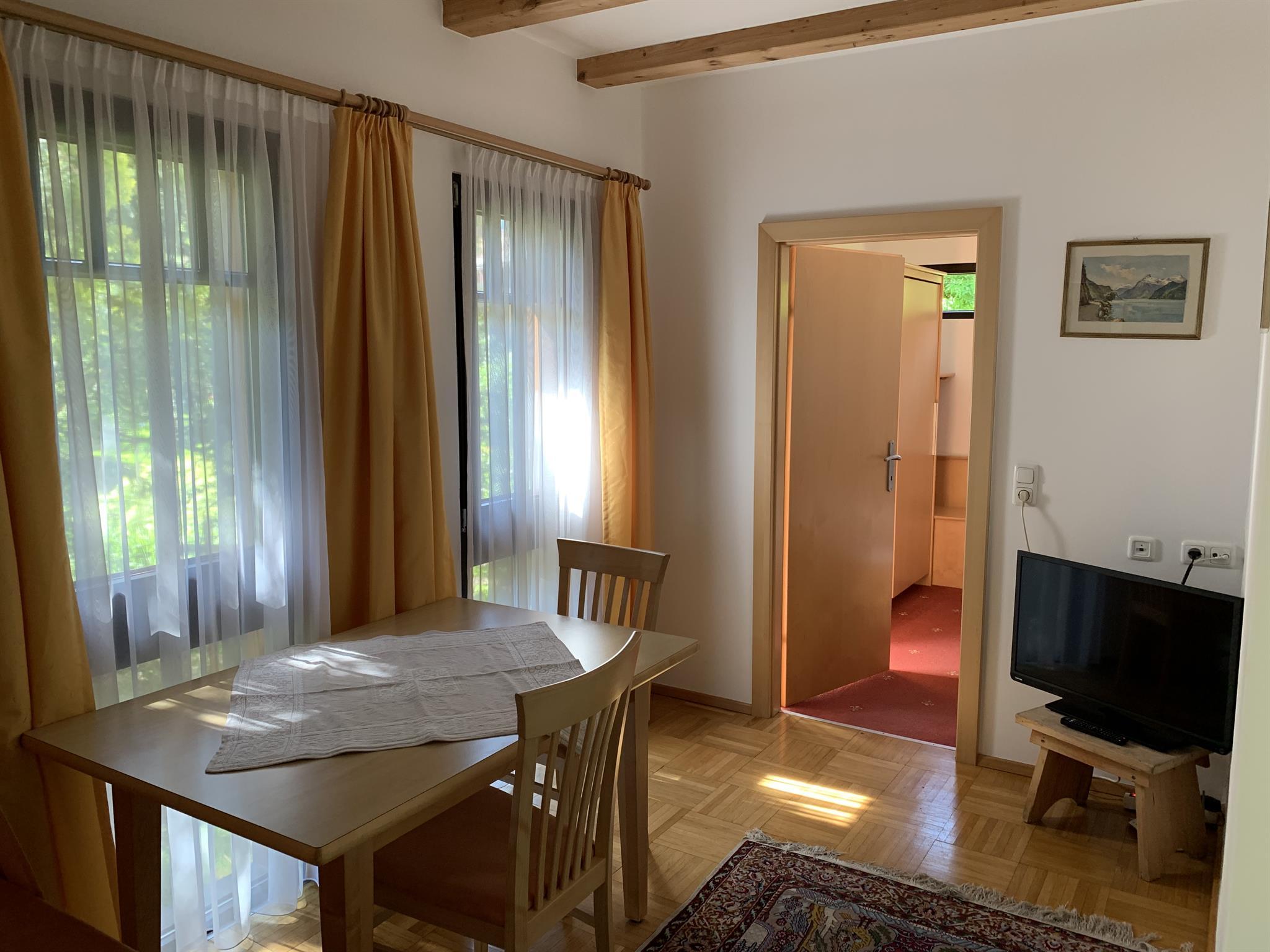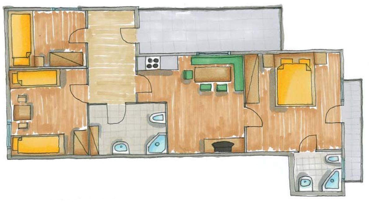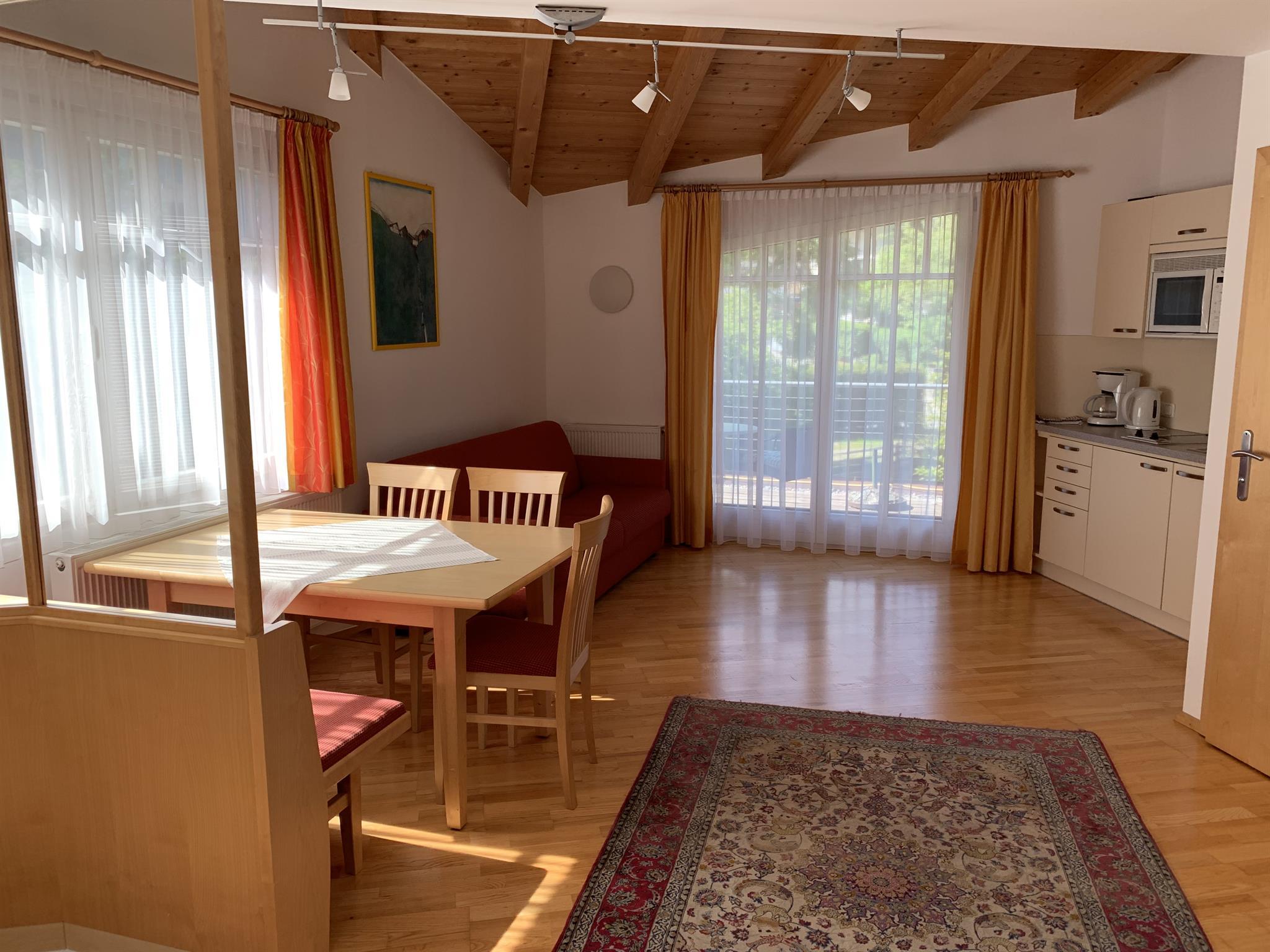 Einzelzimmer, 2 Doppelzimmer, Wohn-Küchenraum, 2x Dusche/WC, Vorraum mit Garderobe, separater Eingang, Balkon mit Sitzgelegenheit, Holzboden mit Teppichen, ruhig, nebenan Bäckerei und Lebensmittelgeschäft, Seilbahnen in unmittelbarer Nähe.