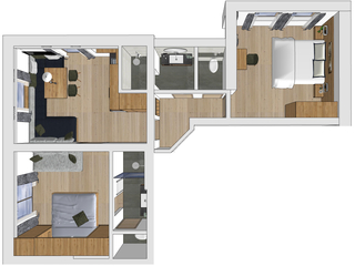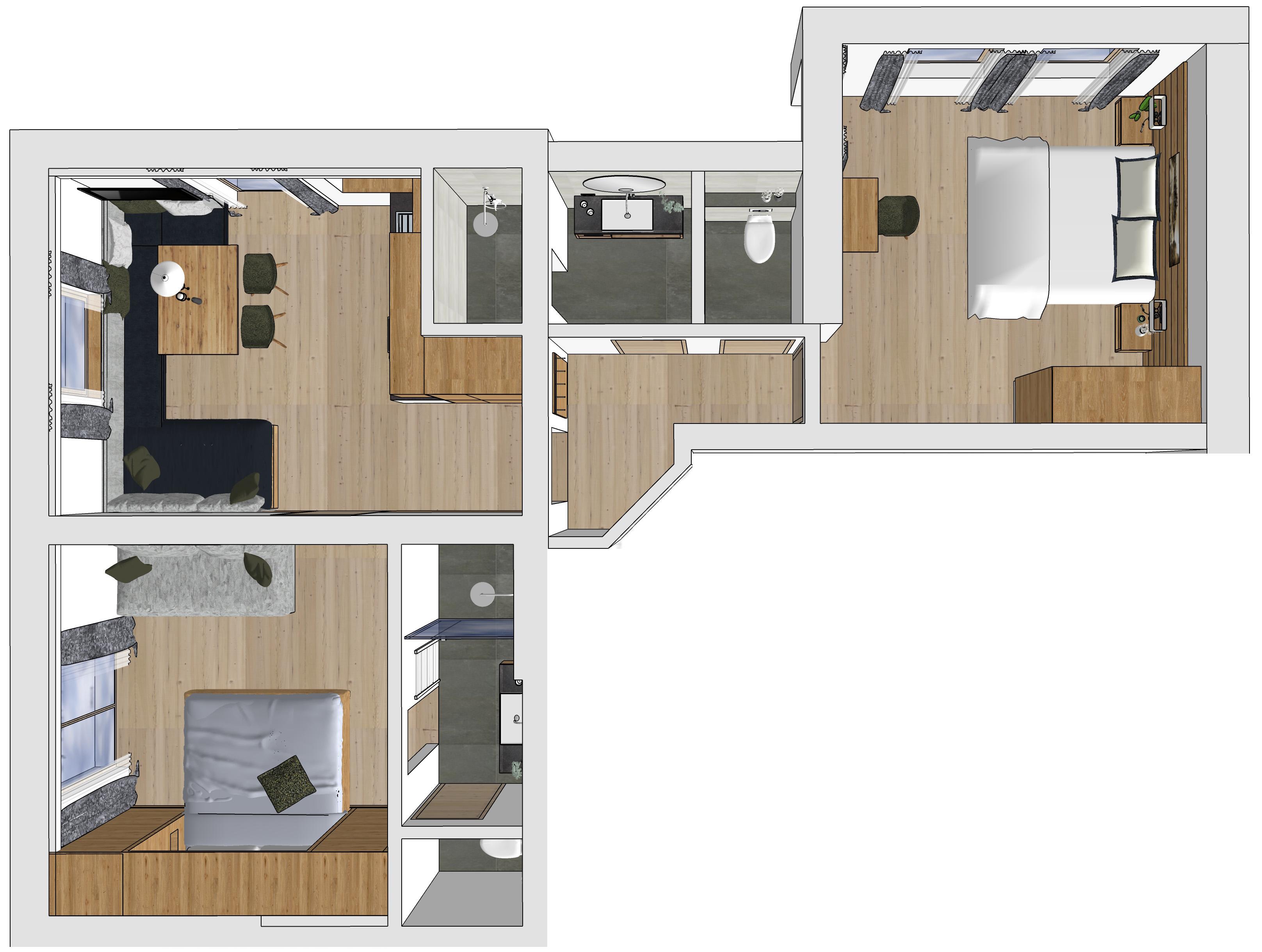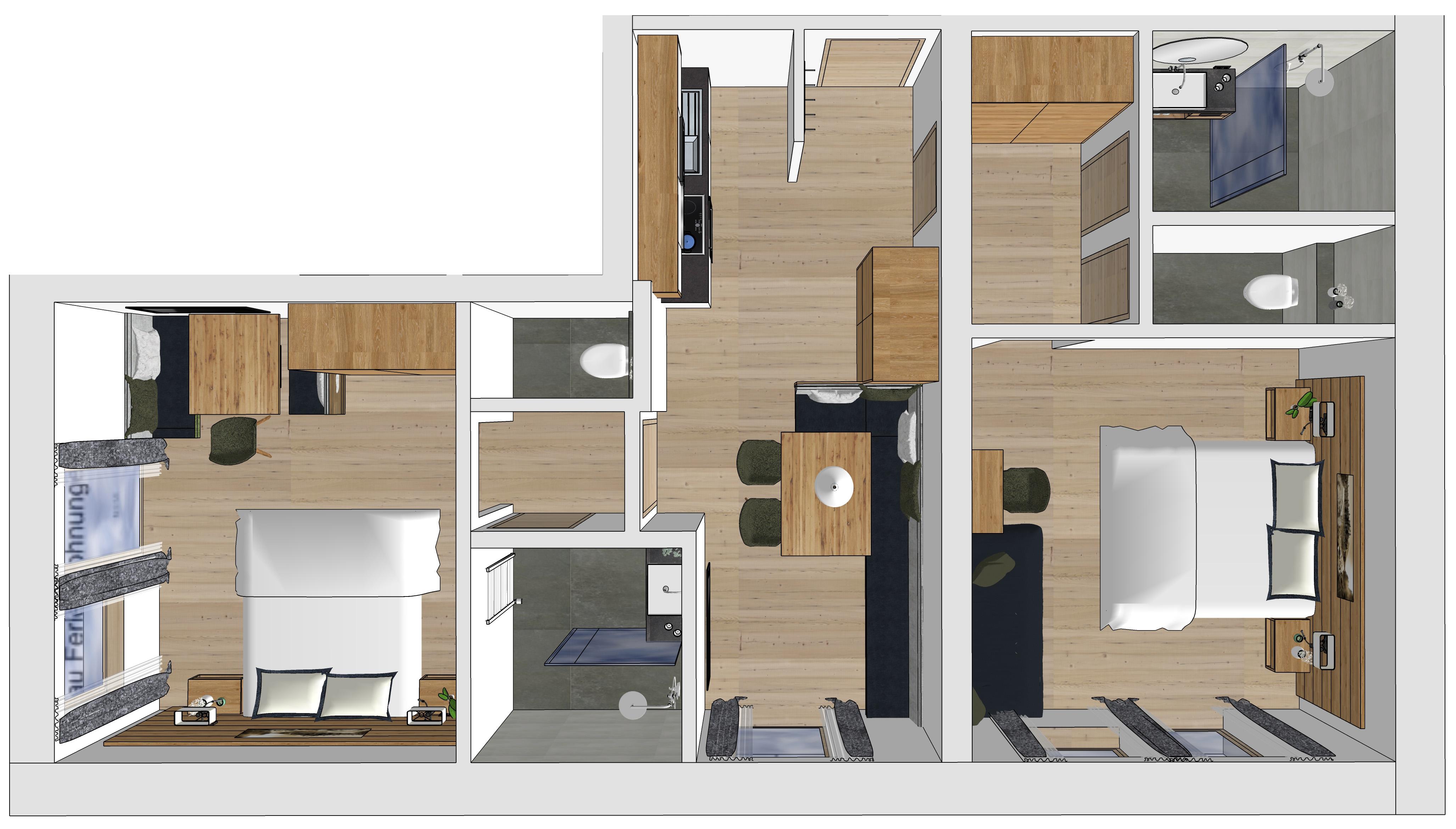 Dieses Appartement verfügt über ein Dreibettzimmer und ein Doppelzimmer inkl.Bettwäsche, Wohnküche mit einer Schlafcouch und zwei getrennte Badezimmer. Die voll eingerichtete Küche verfügt über ein Cerankochfeld, Backofen, Mikrowelle, Geschirrspüler,