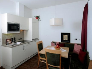 Ferienwohnung 8 / 11 ca. 34 m - geeignet für 2 (bis max. 4 Personen) offenes Wohn-Schlafzimmer mit Dusche und getrenntem WC, voll eingerichtete Wohnküche mit Sitzecke und ausziehbarem Liegesofa (Herd, Mikrowelle, Kühlschrank, Geschirr, Geschirspüler,