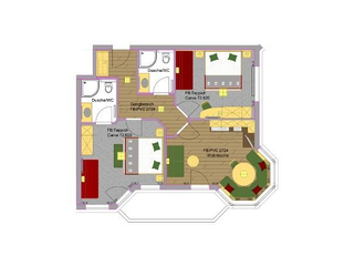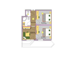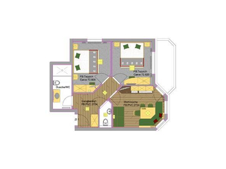 Ferienwohnung 2 / 5 / 6 ca. 63 m - geeignet für 6 (bis max. 8) Personen Vorraum mit Garderobe 2 getrennte 3-Bett-Zimmer mit eigener Dusche/WC mit Radio gemütlich und voll eingerichtete Wohnküche mit Sitzecke und ausziehbarem Liegesofa (Herd, Mikrowelle,