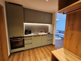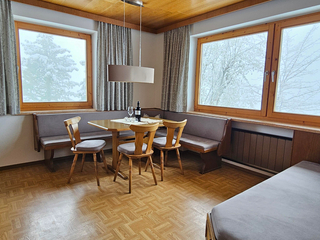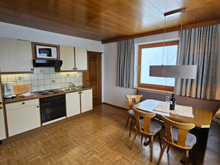 In unserer ca. 45m² großen Ferienwohnung haben Sie zu zweit mehr als genug Raum für einen entspannten Aufenthalt. Hier findet sich eine geräumige Wohnküche mit Essbereich. Die Küche ist ausgestattet mit einem Elektroherd, einem Backrohr, einem Kühlschrank