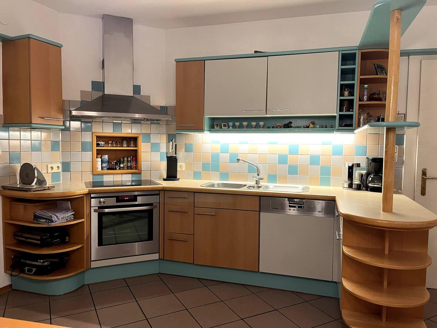 Voll ausgestattete Küche mit Induktionsherd, Backrohr, Dampfgarer, Wasserkocher, Kaffeemaschine, Toaster, Mixer, Kühlschrank und Gefrierschrank sowie umfangreiches Geschirr.