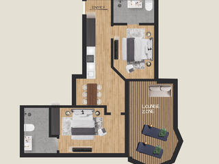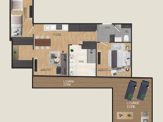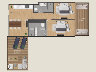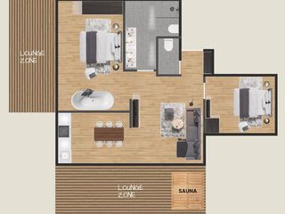 Ausstattung Zwei Schlafzimmer mit vier Schlafplätzen Wohnbereich mit voll ausgestatteter Küche Großzügiges Badezimmer mit separatem WC Bettwäsche Dusch- und Handtücher Fön und Kosmetikspiegel Großzügige Outdoor-Lounge Zone