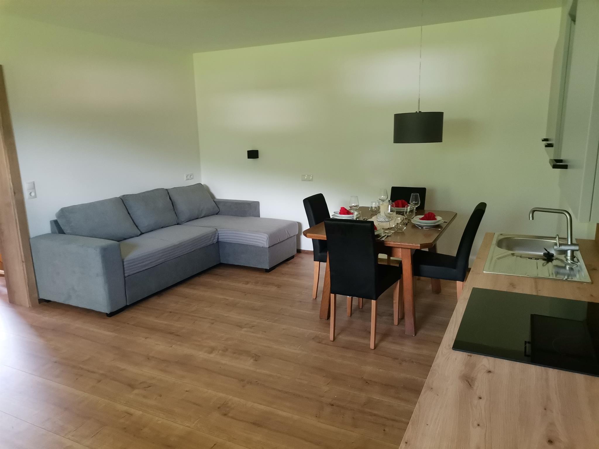 Die Ferienwohnung Bietet Ihnen 1 Schlafzimmer, ein Badezimmer mit Dusche und 1 Wc, einen sitzbereich mit Flachbild-Sat TV sowie eine Küchenzeile mit Geschirrspühlmaschine und einen Essbereich.