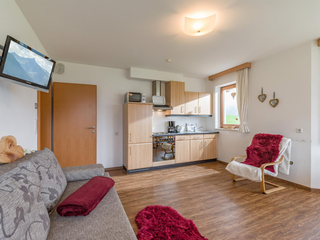 Gemütliche 3-Zimmer-Wohnung im Erdgeschoss mit 75m2, separatem Eingang und voll ausgestatteter Küche. Im Wohnbereich befindet sich eine Doppelbettcouch, TV, Esstich im Erker mit Panoramablick und ein Terrassenausgang. Es gibt 2 kuschelige Doppelzimmer