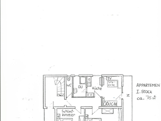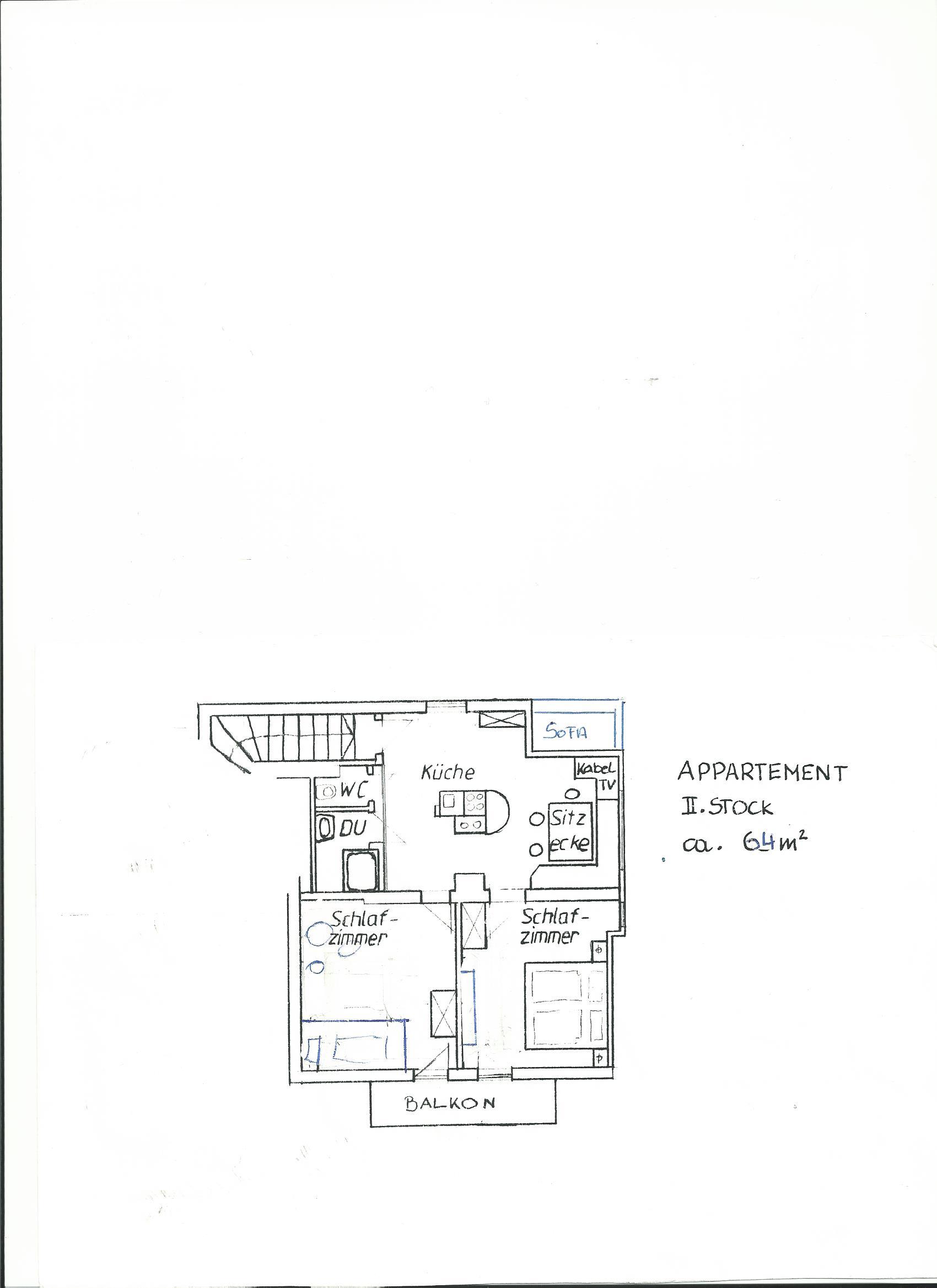1 Doppelzimmer mit Waschbecken 1 Doppelzimmer 1 Wohnraum mit Sitzecke und Sofa, Küchenblock mit Spülmaschine, Herd mit Backrohr, Kaffeemaschine, Mikrowelle 1 Dusche und separates WC gr. Balkon nach Süden und Westen 75 m2 im 1. Stock