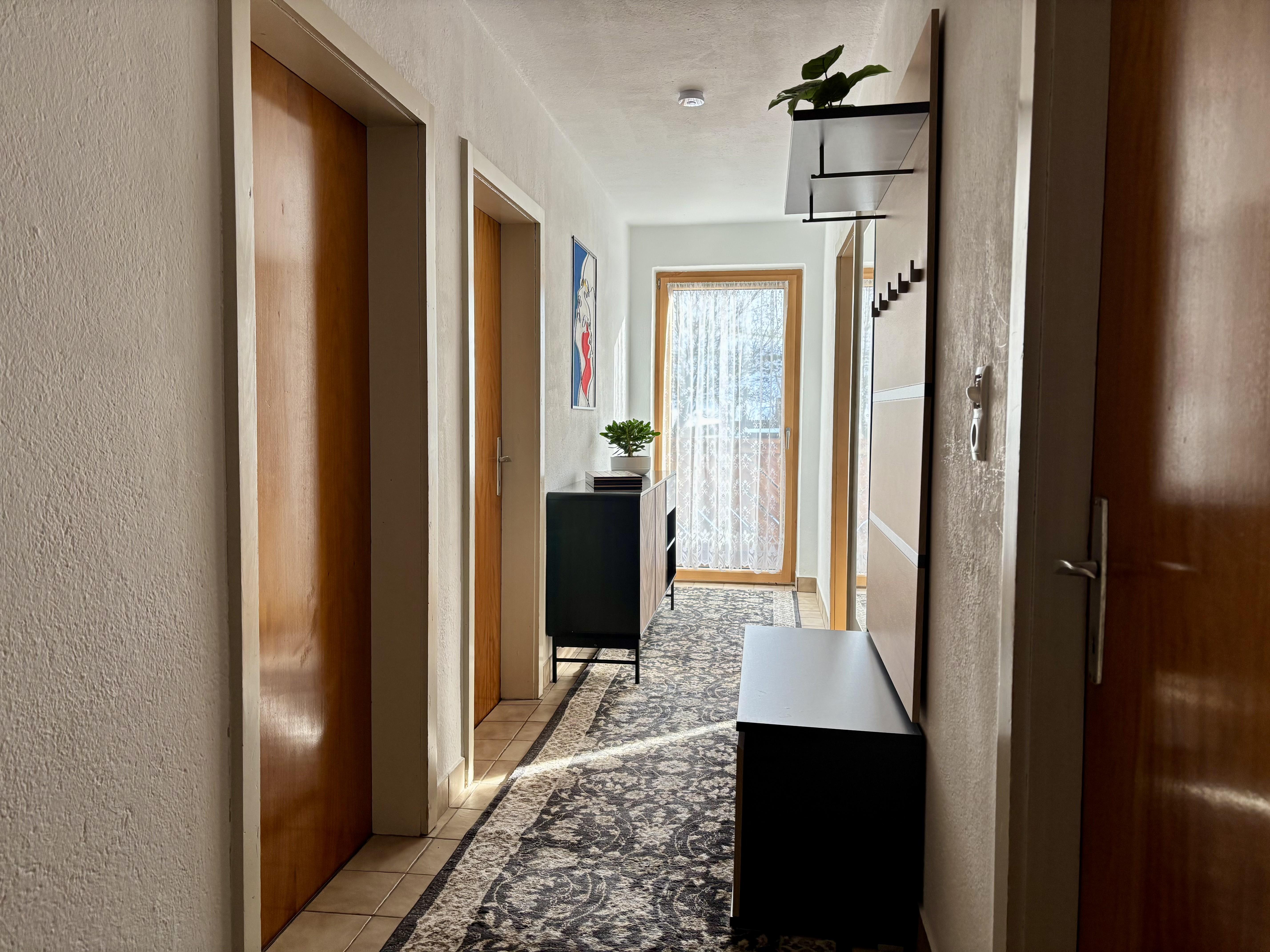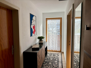 Gemütliche Ferienwohnung mit voll ausgestatteter Küche mit Spülmaschine, Wohnzimmer mit ausziehbarer Couch und Flat - Tv sowie 2 Schlafzimmern mit Doppelbetten und jeweils Bad und WC. DIe Ferienwohnung liegt südseitig und ist mit einem Balkon