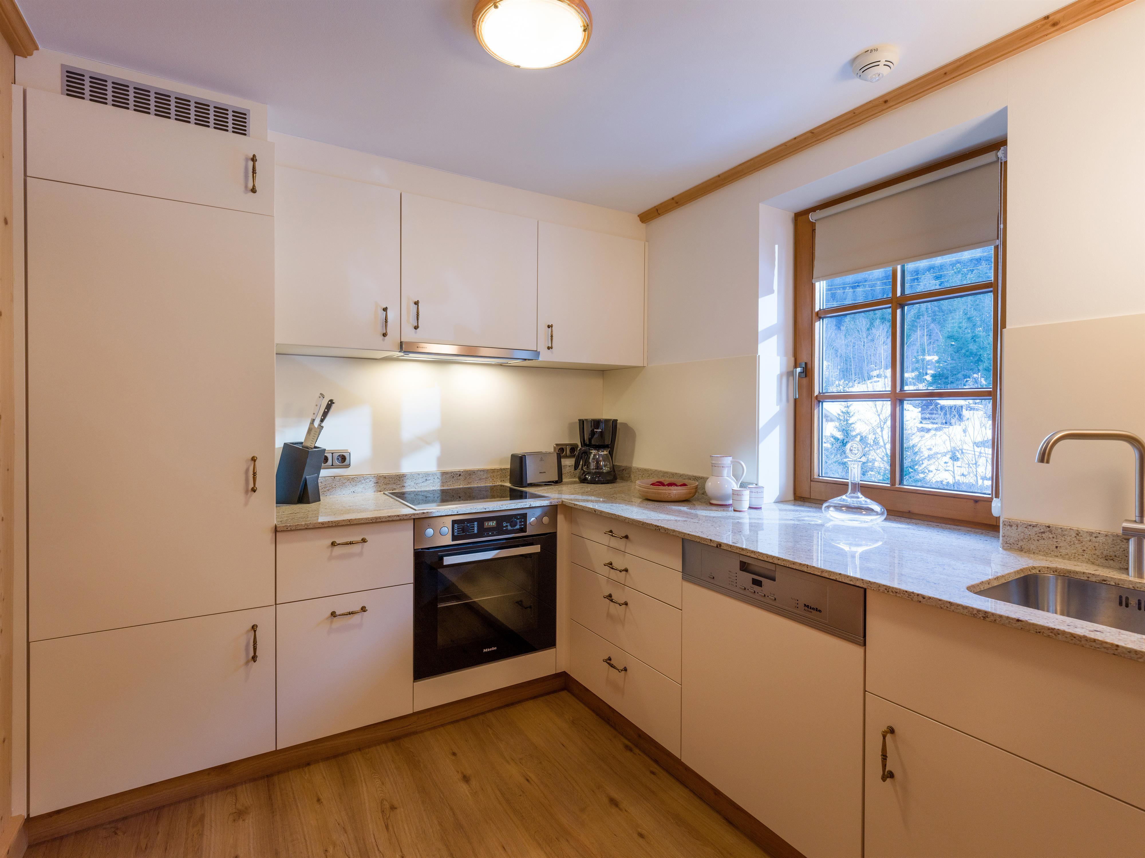 Neu renovierte Einbauküche mit hochwertigen Geräten wie Geschirrspüler, Gefrier-Kühlkombi, E-Herd, Toaster, Wasserkocher, Filterkaffeemaschine. Wohn-Essraum mit Bauerntisch, ausziehbarer Joka Couch für 3. Person (auf Anfrage) Flat TV, Dusche/WC mit
