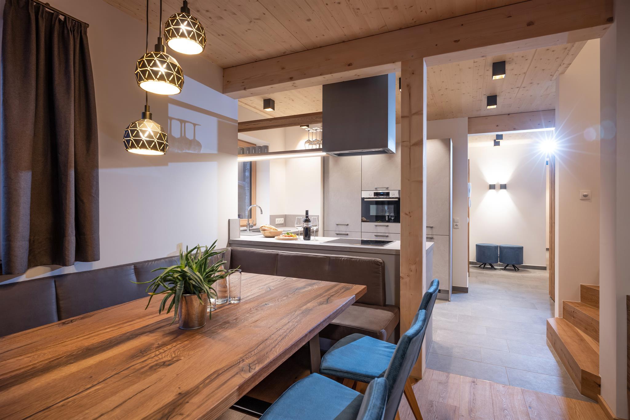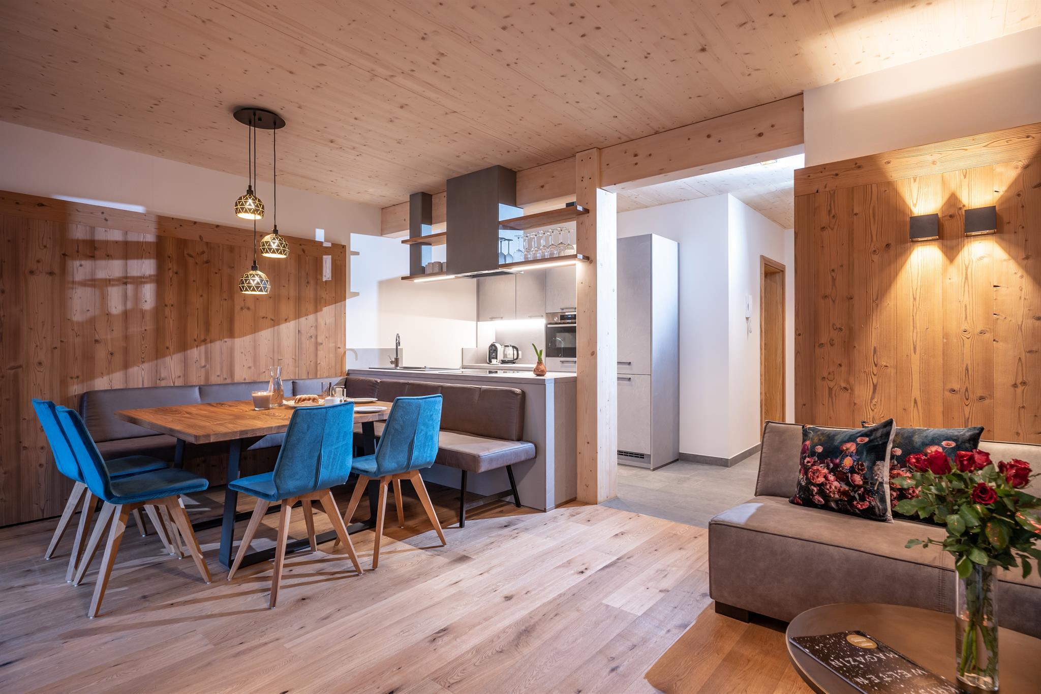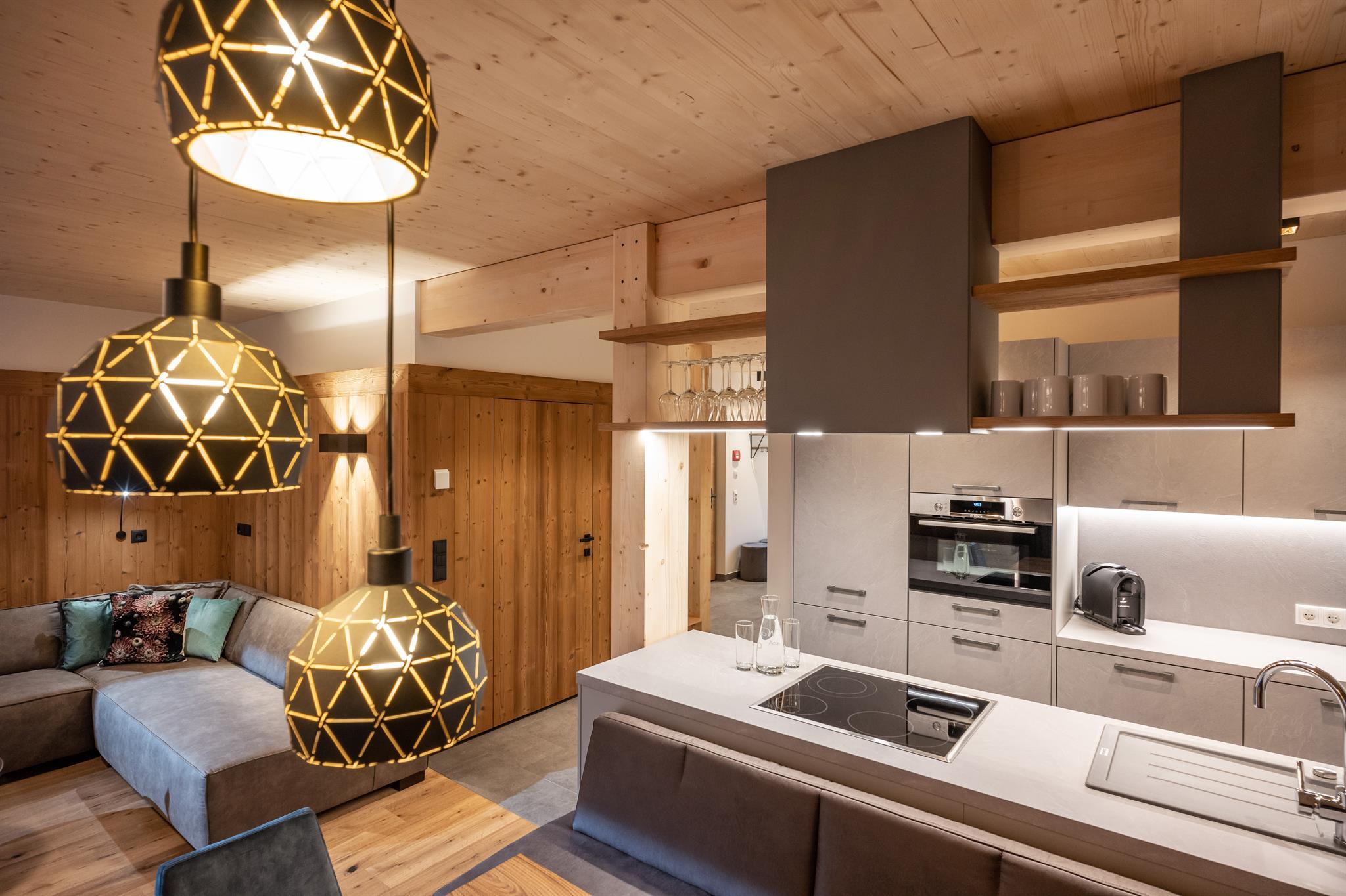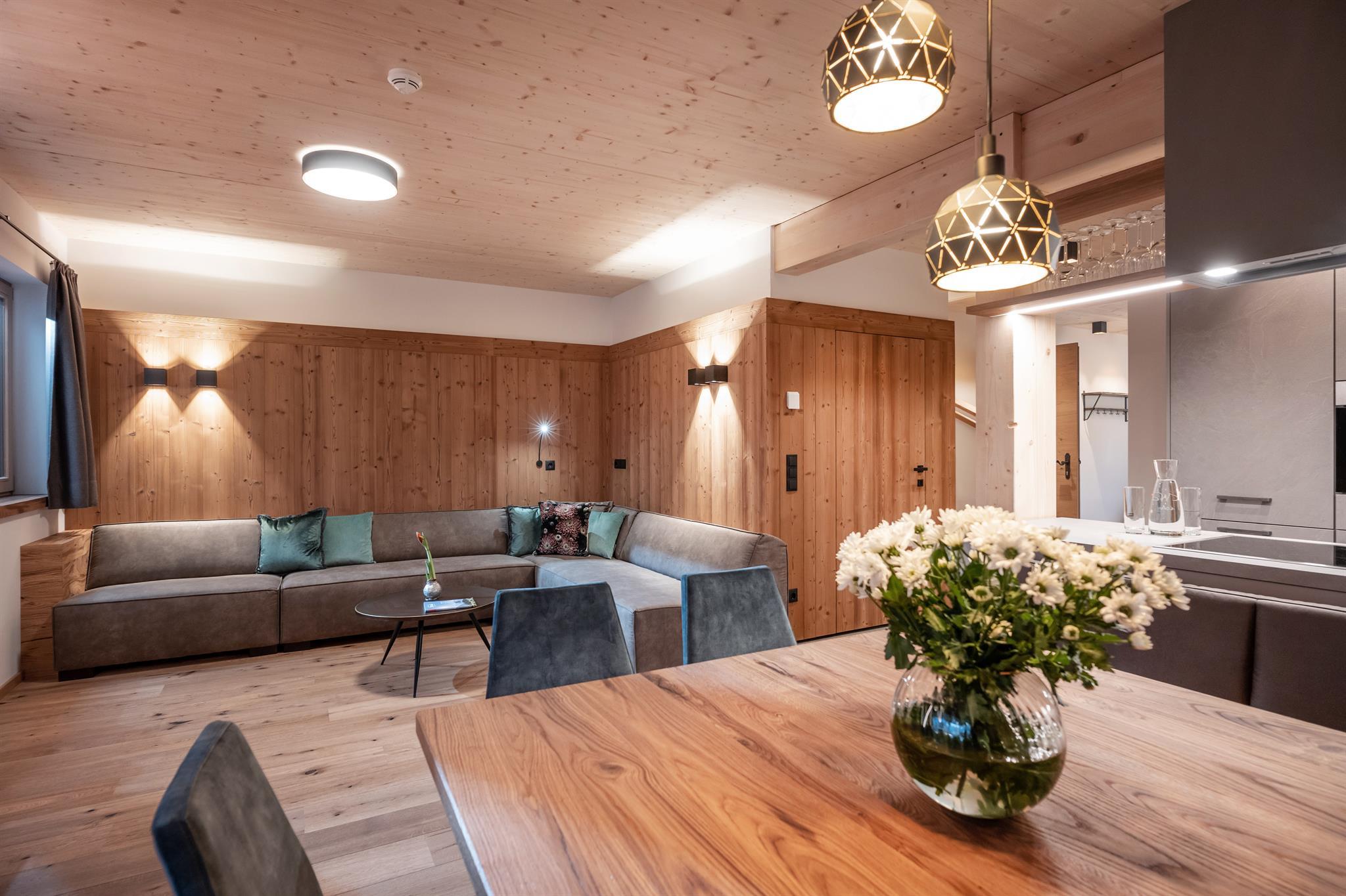 132m² für 8-10 Personen - geräumige Garderobe mit Sitzgelegenheit - 3 stilvolle Schlafzimmer mit hochwertigen Boxspring-Doppelbetten - zusätzlich 1 Panorama Schlafzimmer-Suite mit Ahornblick - vollausgestattete moderne Küche - gemütlicher Wohnraum